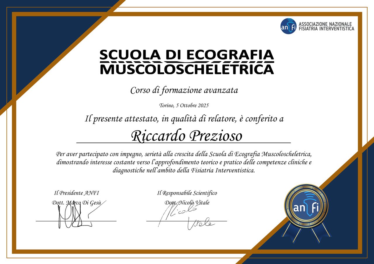 Sono il Dott. Riccardo Prezioso, specialista in Medicina Fisica e Riabilitativa. Svolgo la mia professione con particolare interesse per la fisiatria interventistica e la cura delle patologie muscolari, tendinee e articolari.