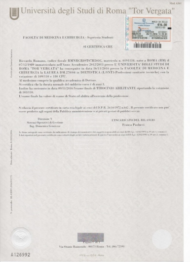 Mi sono laureato in Dietistica presso la facoltà di Medicina e Chirurgia nell’Università degli studi di Roma "Tor Vergata"nel 2016 e successivamente, dal 2018, sono iscritto all'albo professionale dei Dietisti.