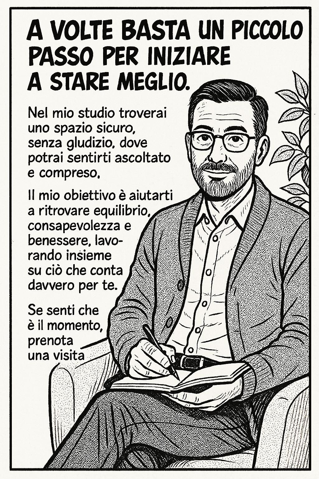 Sono uno Psicologo Clinico e Psicoterapeuta cognitivo-comportamentale in specializzazione. Iscritto all'ordine degli Psicologi del Piemonte(n.10697). Psicologo con formazione per l'aiuto dei disturbi di panico, ansia, depressione, disturbo ossessivo-compulsivo. Lavoro con adulti, coppie e adolescenti.