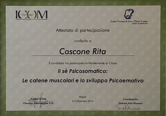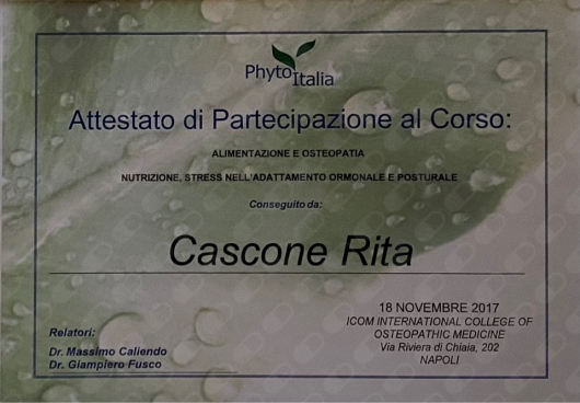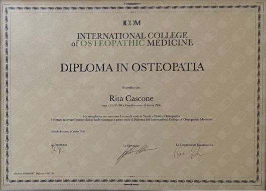 Ho conseguito il titolo D.O. presso l'International College of Osteopathic Medicine (ICOM) di Napoli, con un percorso di 5 anni full time e tirocinio clinico.
