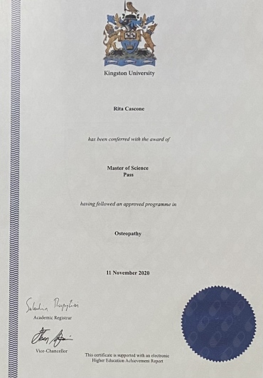 Ho conseguito la Laurea Inglese (MSc Ost), presso la Kingston University (NESCOT) con sede ad Epsom (UK).