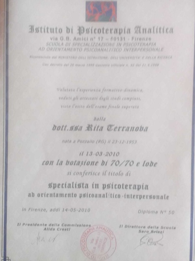 Mi sono specializzata in psicoterapia ad orientamento psicoanalitico interpersonale presso l’Istituto di Psicoterapia Analitica di Firenze, di cui sono docente e socia ordinaria. Sono iscritta all’Ordine degli Psicologi della Toscana con abilitazione alla psicoterapia.