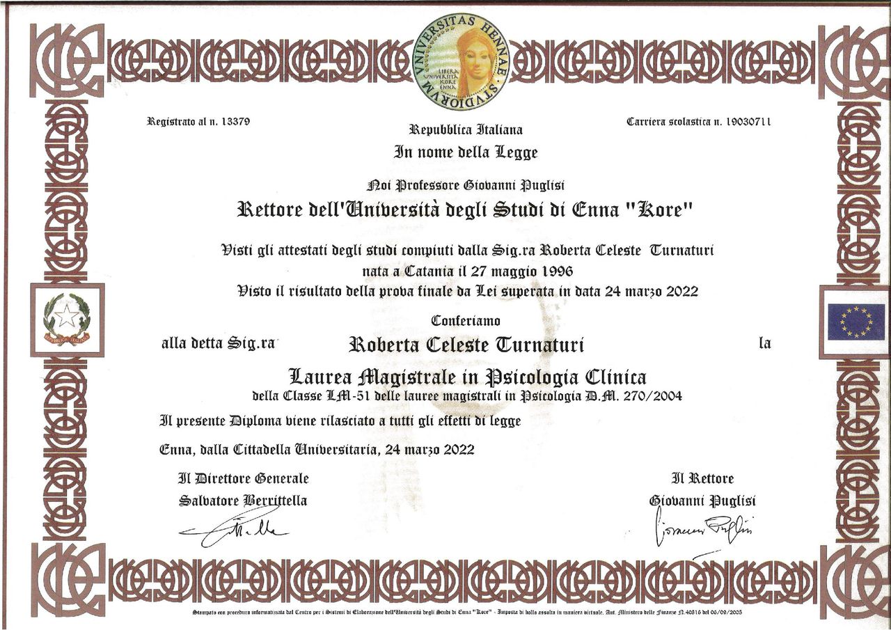 Sono Psicologa Clinica iscritta all’Ordine degli Psicologi della Regione Sicilia. Frequento la Scuola di Psicoterapia in Psicologia Psicoanalitica del Sé e Psicoanalisi Relazionale - ISIPSE' di Roma. Sono impegnata in un percorso analitico personale con uno psicoterapeuta psicoanalista, esperienza che considero parte integrante e fondamentale della mia formazione.