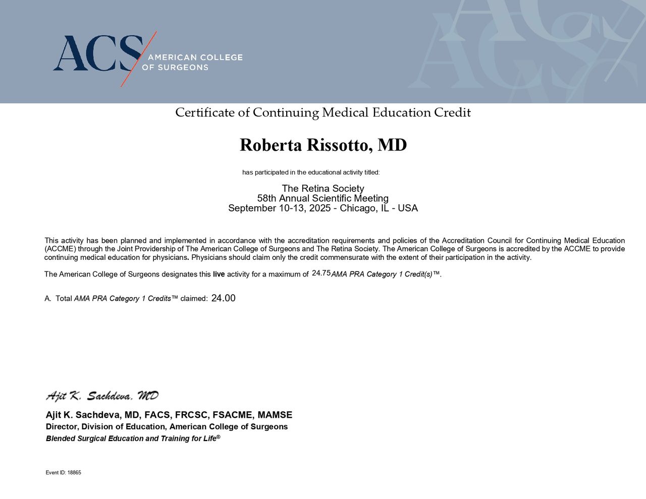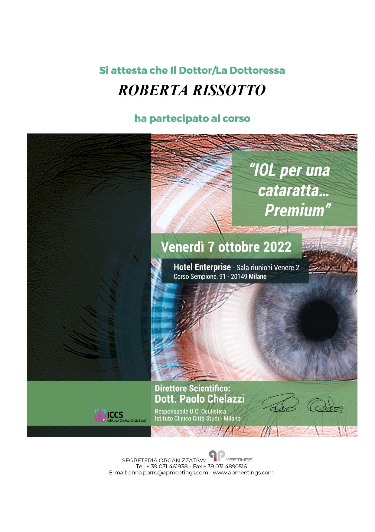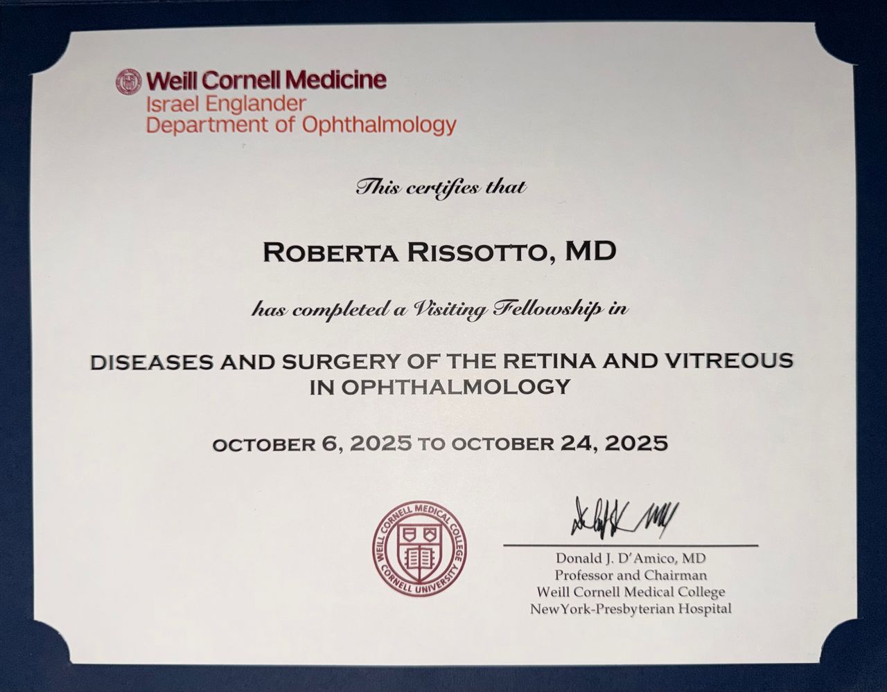 Sono la Dott.ssa Roberta Rissotto, oculista specializzata nella diagnosi e nel trattamento medico-chirurgico di patologie della retina e del vitreo. Laureata all'Università Cattolica del Sacro Cuore e specializzata a pieni voti presso l'Università degli Studi di Milano, ho integrato la mia formazione con periodi negli Stati Uniti.