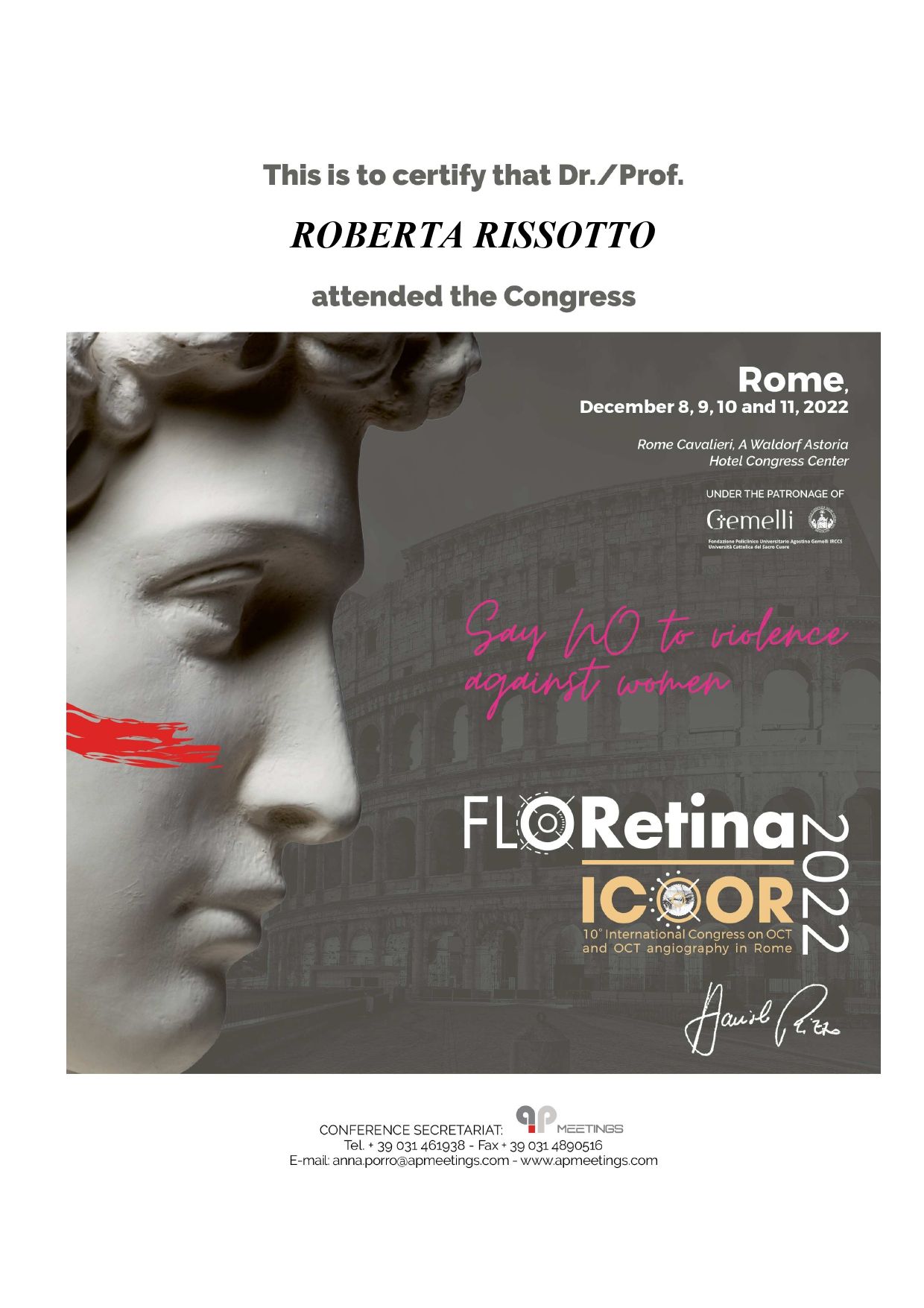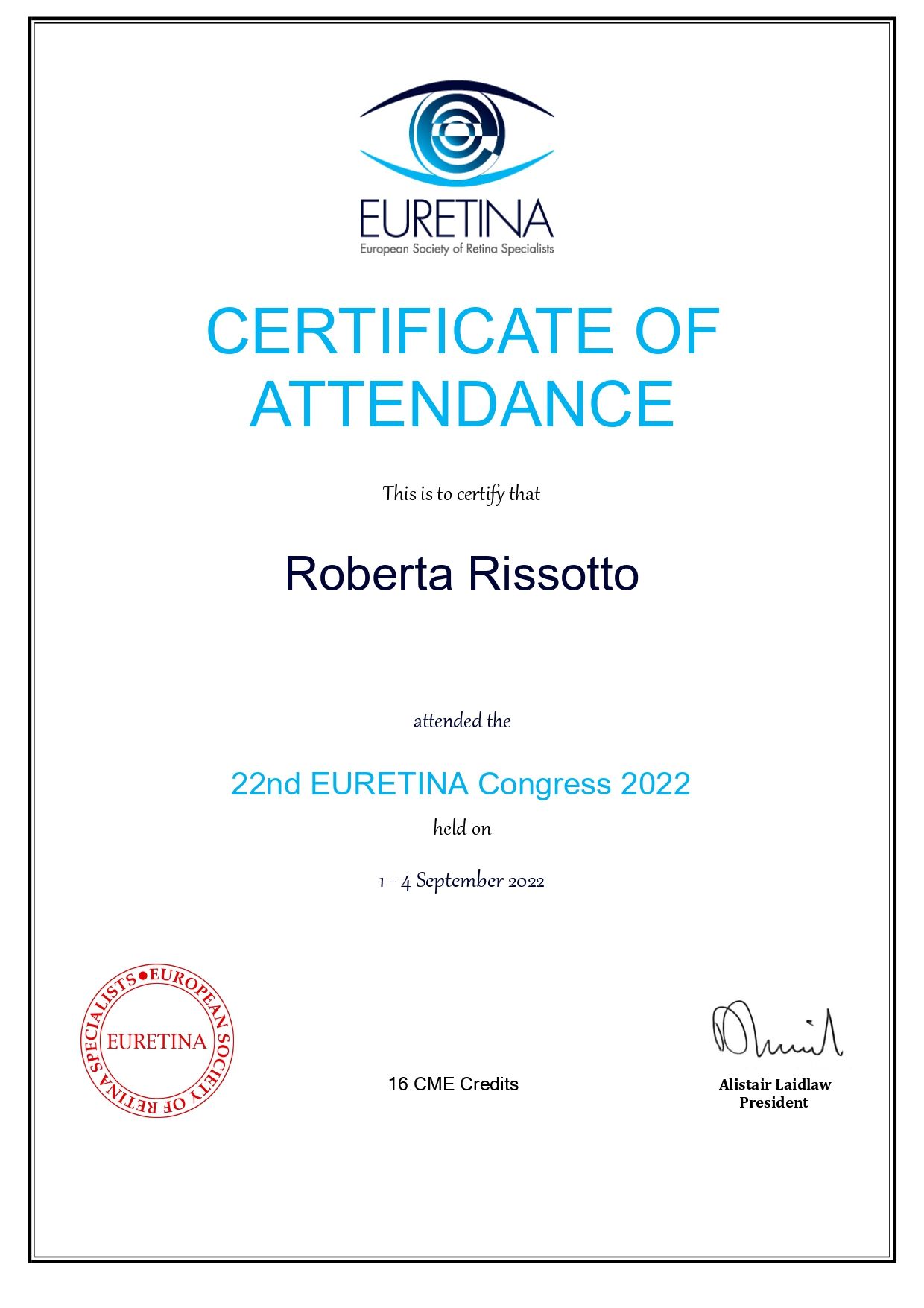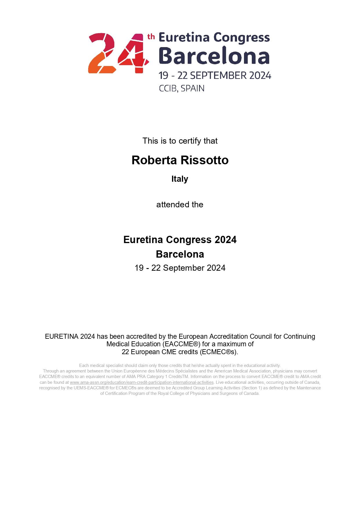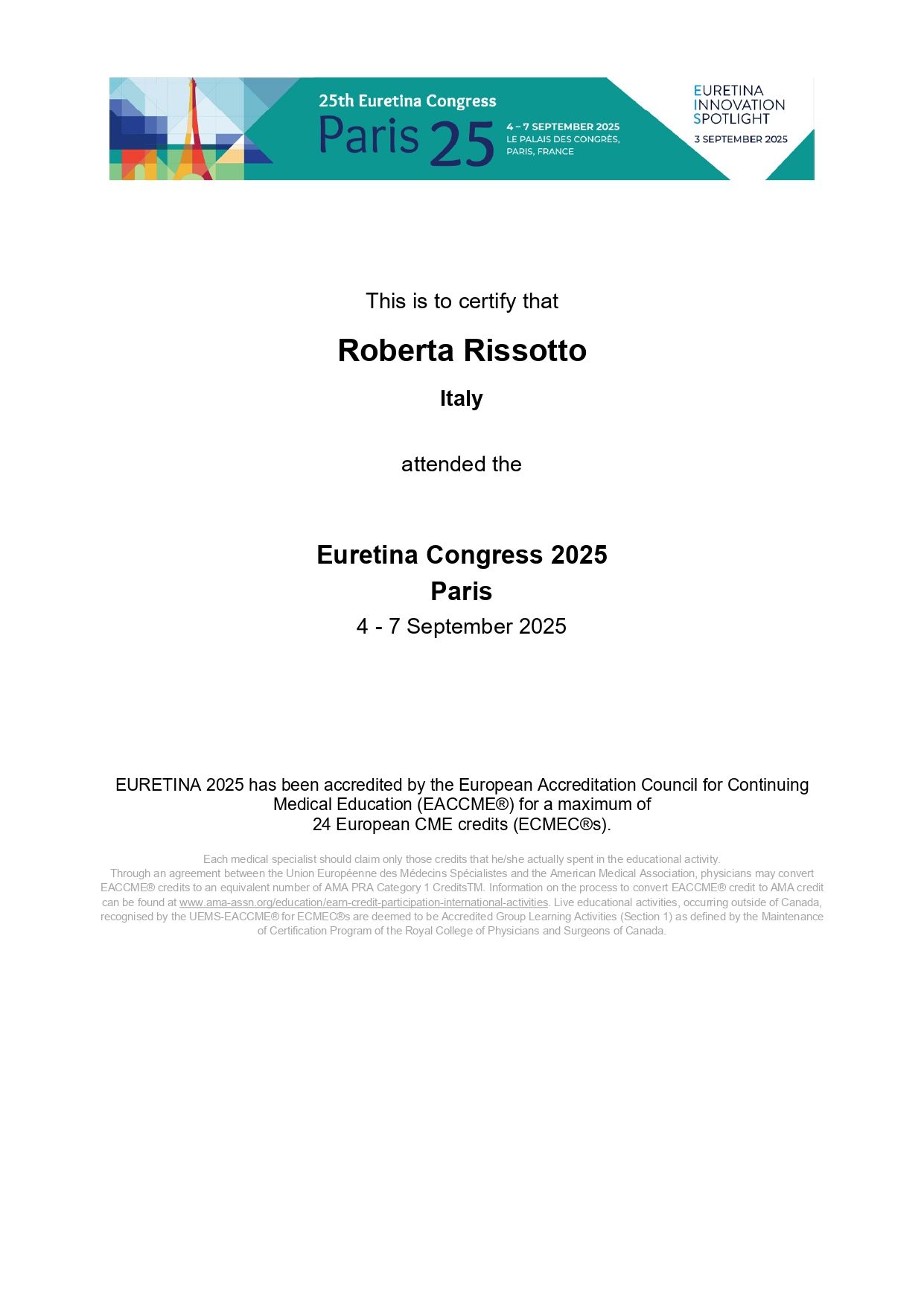 Sono la Dott.ssa Roberta Rissotto, oculista specializzata nella diagnosi e nel trattamento medico-chirurgico di patologie della retina e del vitreo. Laureata all'Università Cattolica del Sacro Cuore e specializzata a pieni voti presso l'Università degli Studi di Milano, ho integrato la mia formazione con periodi negli Stati Uniti.