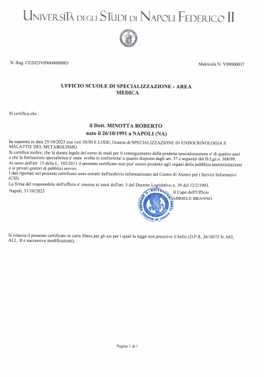 Il mio interesse per l'endocrinologia è nato durante gli studi universitari, in particolare per la patologia oncologica tiroidea. Dopo la laurea, conseguita presso l'Università di Medicina e Chirurgia di Napoli Federico II, ho vinto il concorso per la Scuola di Specializzazione in Endocrinologia e Malattie del Metabolismo. Sin dal primo momento, mi sono occupato di endocrinologia oncologica, con particolare attenzione per la patologia tiroidea oncologica, i tumori neuroendocrini e le manifestazioni legate a sindromi familiari endocrinologiche. Durante il mio percorso, ho approfondito anche il campo dell'andrologia e della endocrinologia pediatrica, tramite dei periodi di formazione in strutture dedicate. Ho conseguito inoltre il diploma nazionale SIUMB per la diagnostica ecografica di tiroide e paratiroidi attraverso un corso dedicato, al fine di garantire al pazienti un quadro completo.