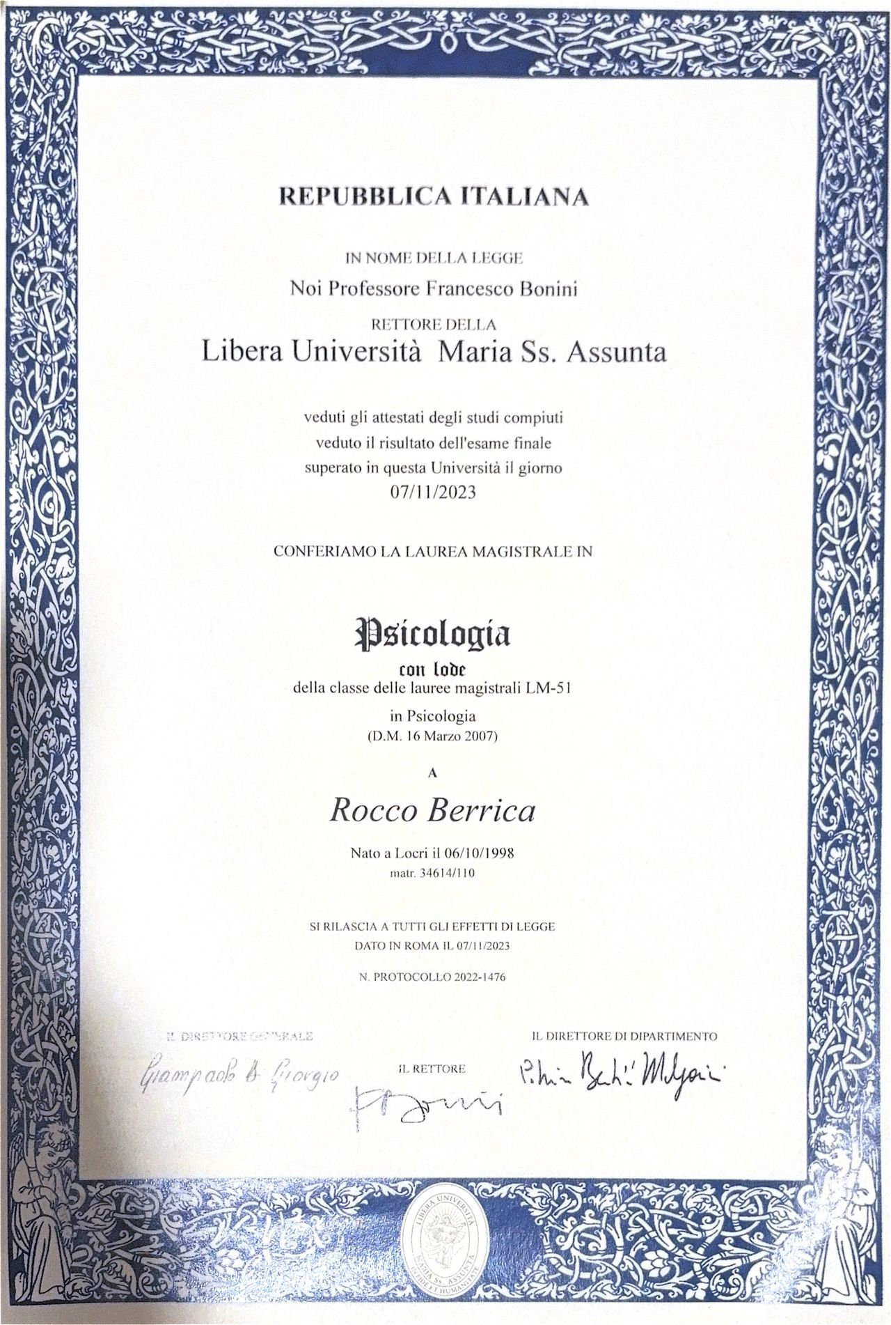 Sono il Dott. Rocco Berrica, Psicologo Clinico iscritto all'Ordine degli Psicologi del Lazio. Sto frequentando la scuola di specializzazione in Psicoterapia ad Orientamento Strategico Integrato (IIRIS, Roma).