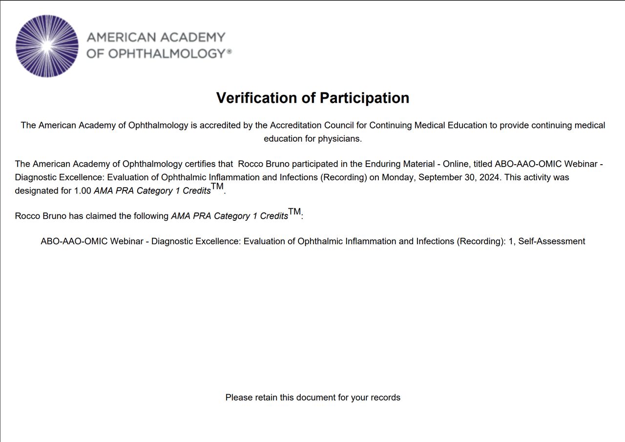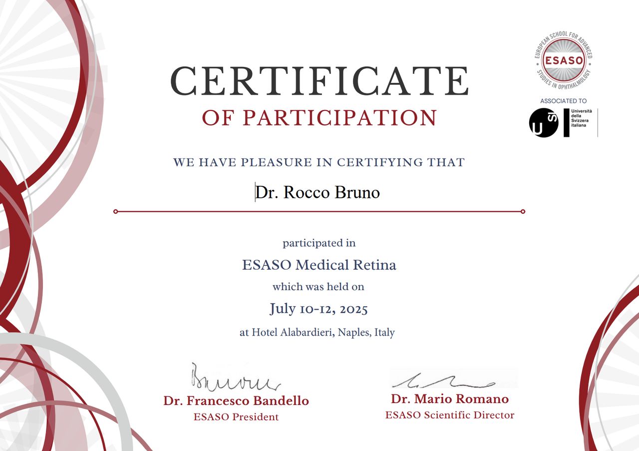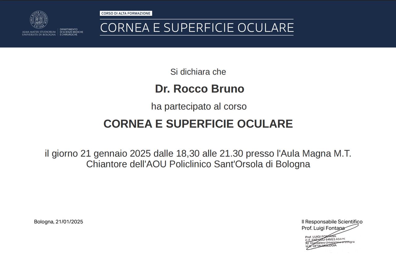 Mi sono laureato in Medicina e Chirurgia nel 2020 presso la Università degli Studi di Perugia e mi sono specializzato in Oftalmologia nel 2025 presso la Università degli Studi 'G. d’Annunzio' di Chieti-Pescara.