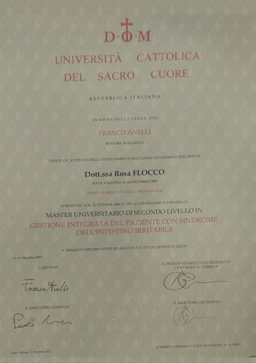 Ho una laurea in Neurobiologia e un Master di Secondo Livello sulla gestione integrata del paziente con sindrome dell'intestino irritabile, ho anche insegnato al Master di "Biologia della Nutrizione per la Riproduzione Umana" presso La Sapienza Università di Roma.