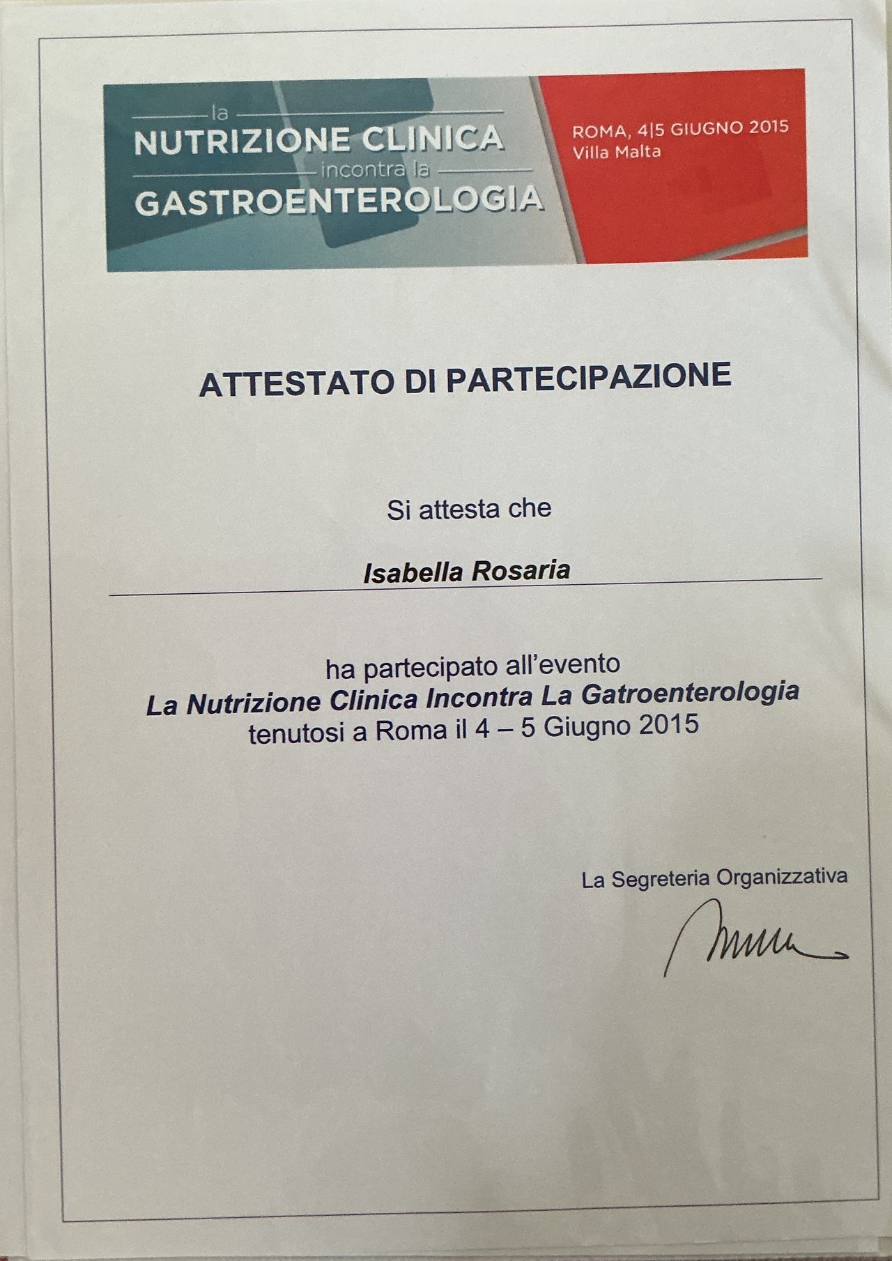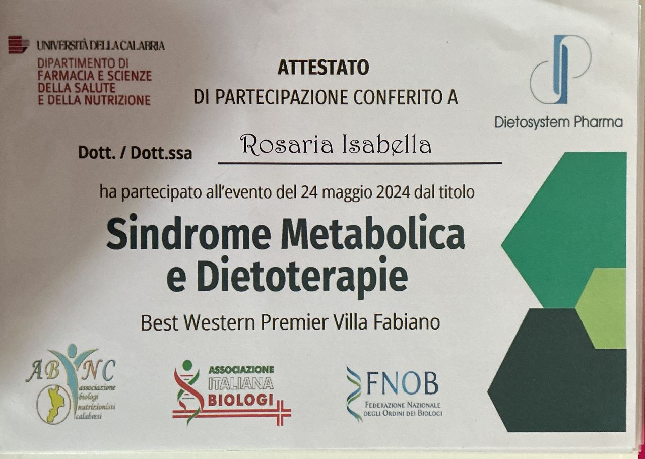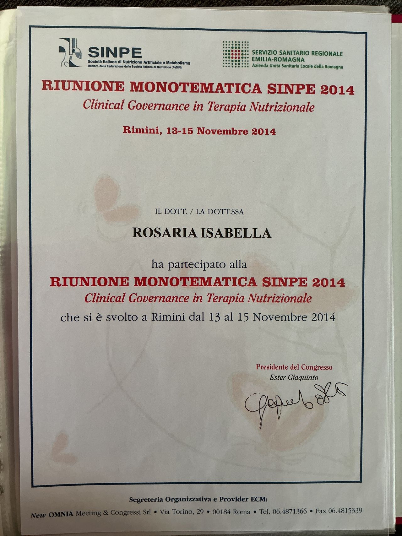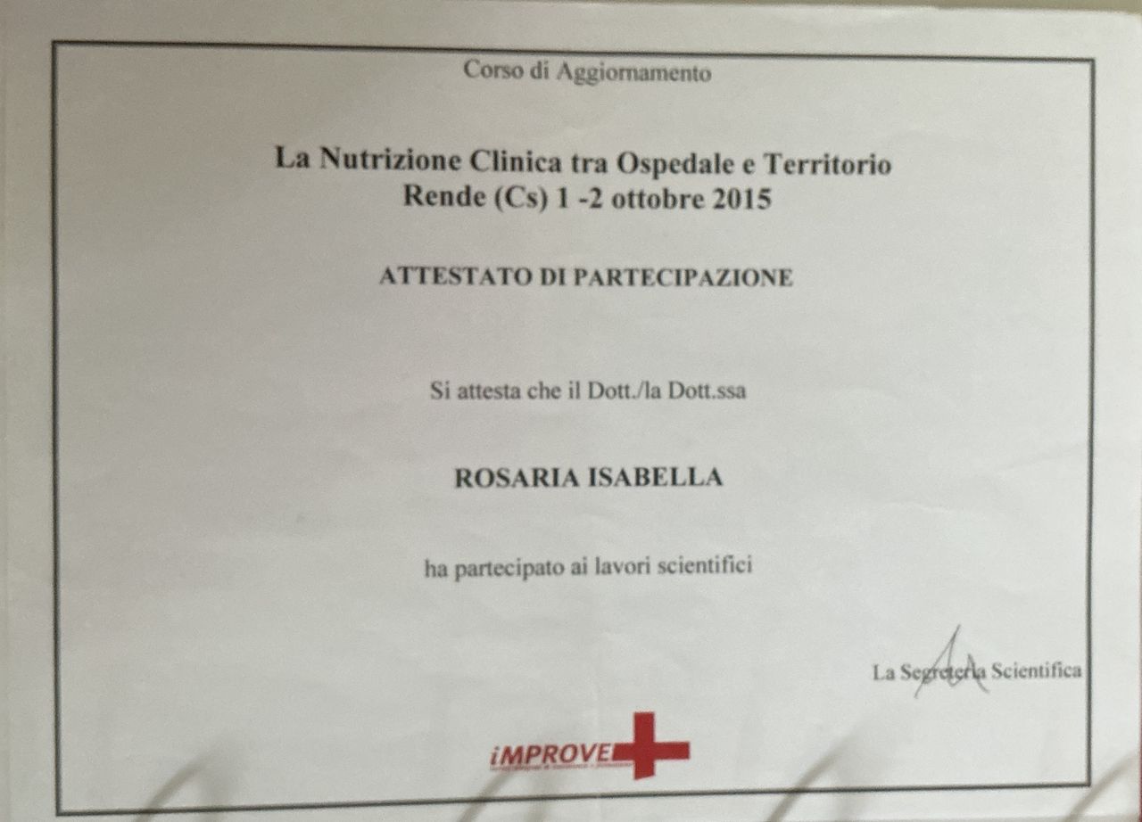 Ho rafforzato le mie competenze con il Diploma di Specializzazione in Scienza dell'Alimentazione, titolo che attesta un'alta formazione clinica e specialistica. Questa expertise mi ha fornito una profonda competenza nella Nutrizione Clinica, gestendo con successo casistiche complesse e percorsi nutrizionali in supporto a patologie e condizioni mediche specifiche.