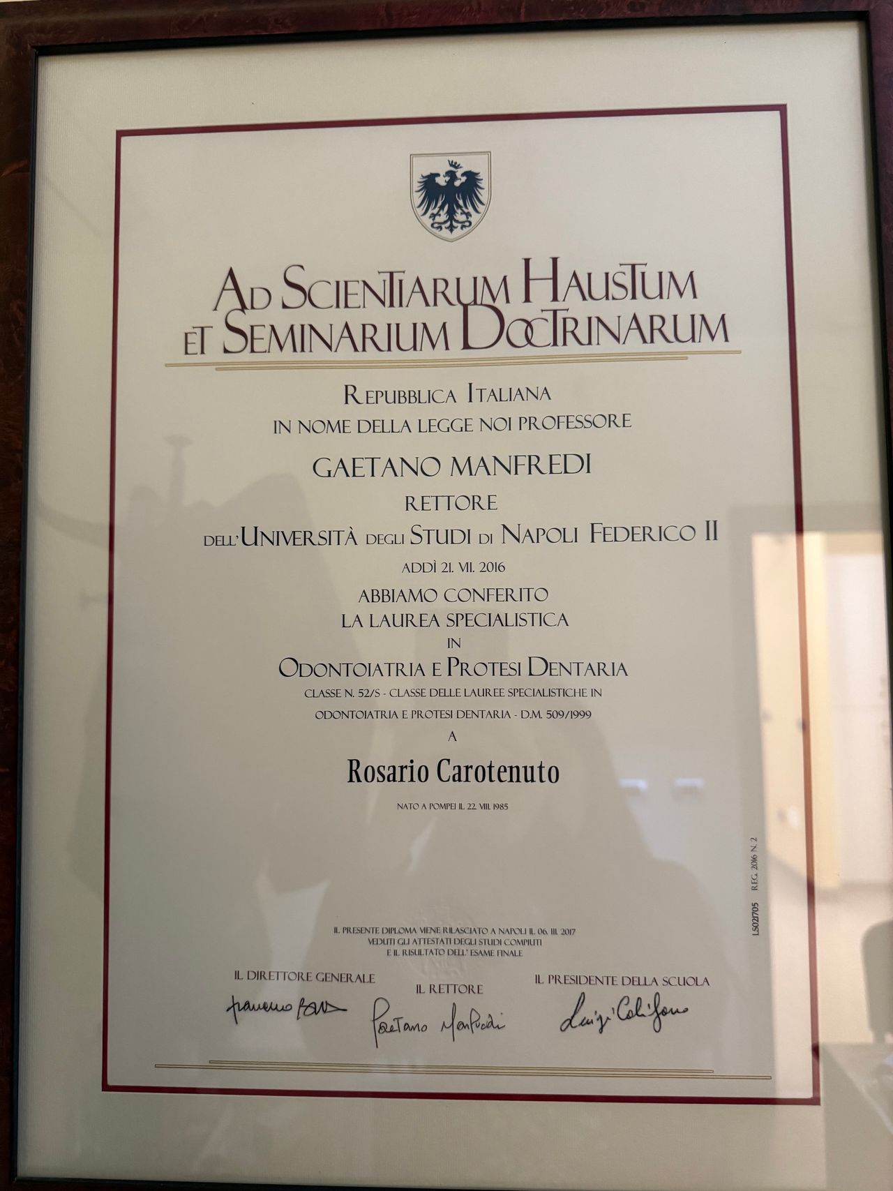 Cinque stelle non bastano! Ho sempre avuto una grande paura del dentista, ma il Dott. Rosario Carotenuto ha cambiato tutto. L'intervento è stato assolutamente indolore e rapidissimo. Spiega ogni passaggio in modo chiaro e ti mette una tranquillità incredibile. L'assistente e tutto lo staff sono gentilissimi e accoglienti. Lo consiglio a chiunque, specialmente a chi ha ansia: vi farà dimenticare di aver paura!"