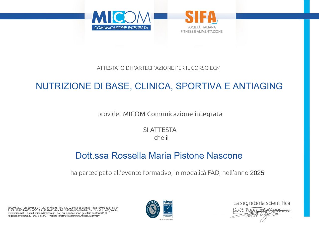 Grazie ai suoi consigli, ho ottenuto risultati concreti, sentendomi meglio sia fisicamente che mentalmente. Consiglio vivamente a chiunque cerchi una nutrizionista competente, attenta e appassionata del proprio lavoro!• Studio Privato • dieta personalizzata •