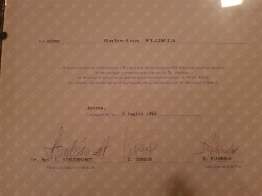 Eseguo il linfodrenaggio Vodder-Foldi (Lega tumori di Ancona 1993- docenti:Dott.C.Schuchhardt,dott.Tomson,Dott.Klumbach),alta casistica nelle mastectomie,insufficienza venosa e stasi arti inferiori e nel campo estetico.