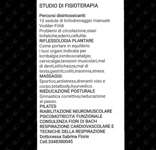 Sono fisioterapista dal1991 con tirocinio svolto all'estero in Germania (Hannover -Baby Pension und Klein Kinder heim)e in Italia(Ospedale Marino di Cagliari con Prof.Velluti in Ortopedia e rianimazione)Divento riflessologa nel 1996(Docente:Maria Garau). 1997(Diploma di Riflessologa docenti:Juana Vaquero Corrales-Giuseppe Cogotzi). 1999(Istituto di Riflessologia a Firenze di Prof. Lo Russo)ottenendo risultati soddisfacenti e tutt'oggi applico tale metodica su pazienti neurologici e ortopedici.Altissima casistica sulle ernie discali,lombalgie,stitichezza,mal di testa,ansia,stress.