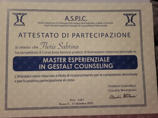 Master di tre anni Counseling della GestaltASPIC di Roma.(2022-2023-2024)Counselor professionista.Iscritta alla REICO. N°1205