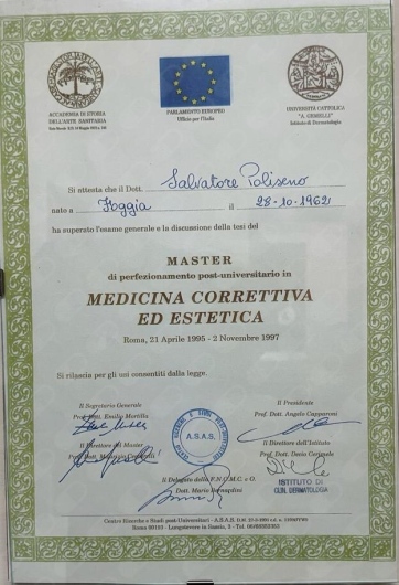 -Master in Medicina Correttiva ed Estetica presso l’Università Fate Bene Fratelli di Roma nel 1994