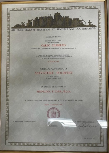 -Laureato in Medicina e Chirurgia presso l’Università degli studi di Napoli FEDERICO II° il 26 luglio 1991.