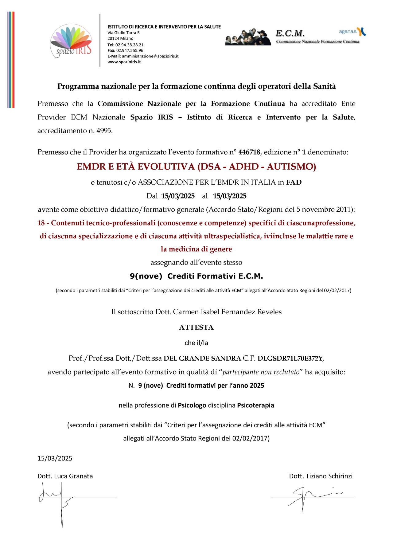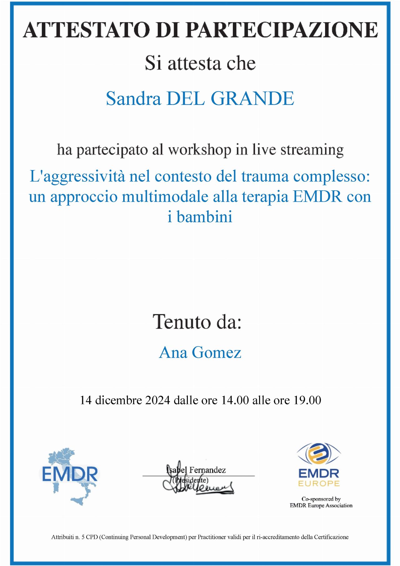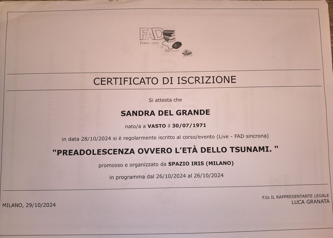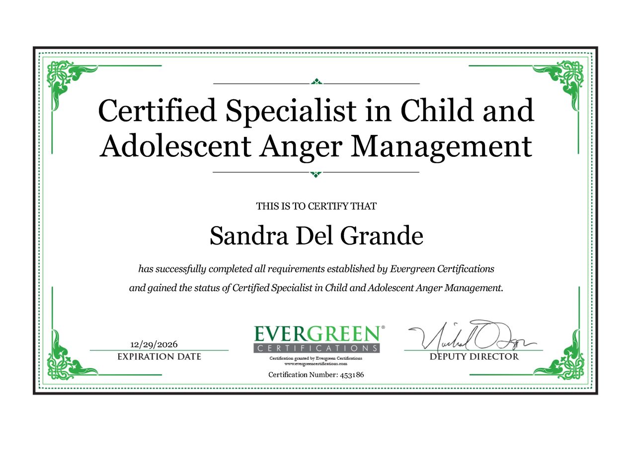 • Specialista certificata iscritta nell’elenco dei professionisti con Evergreen Certification per la gestione della rabbia in bambini e adolescenti