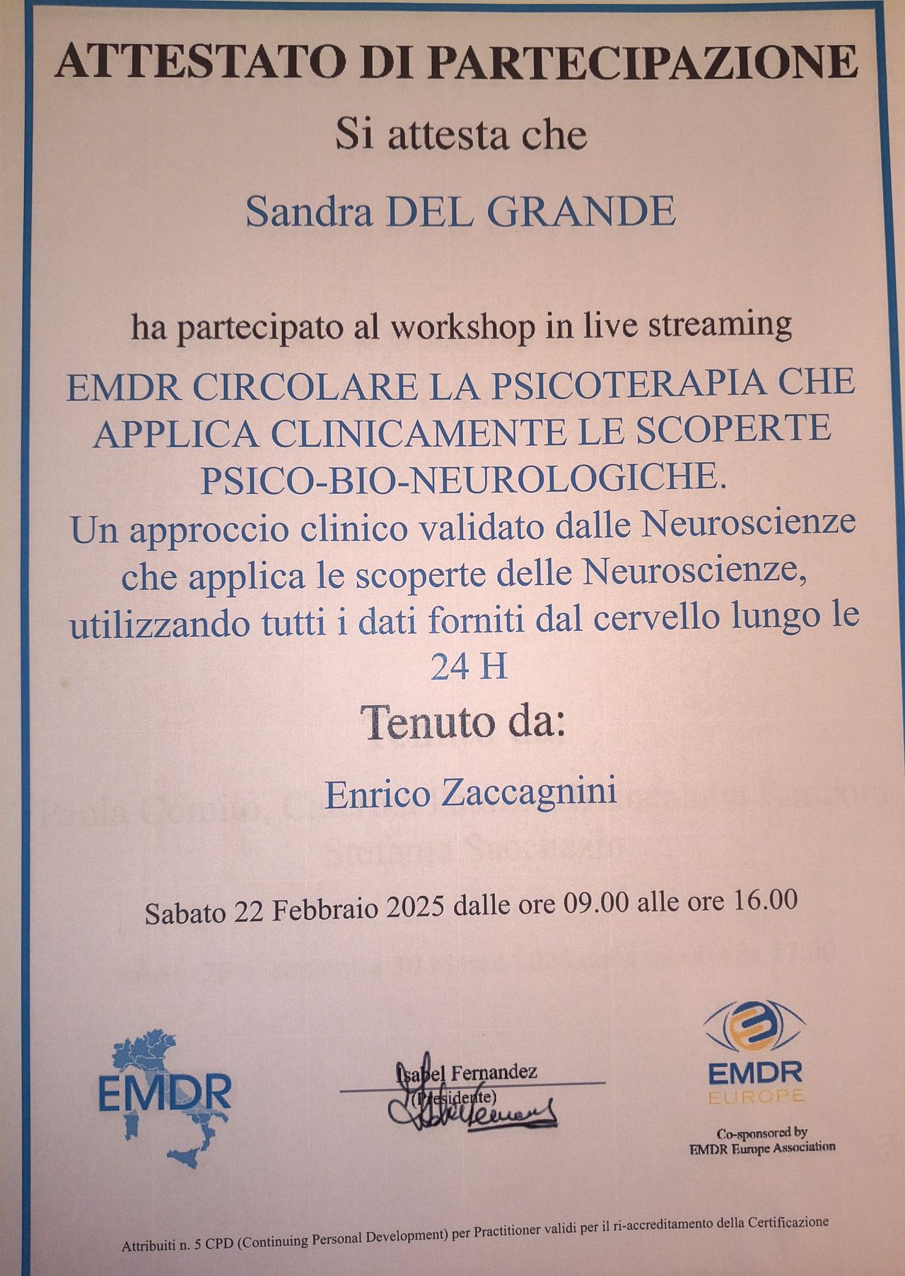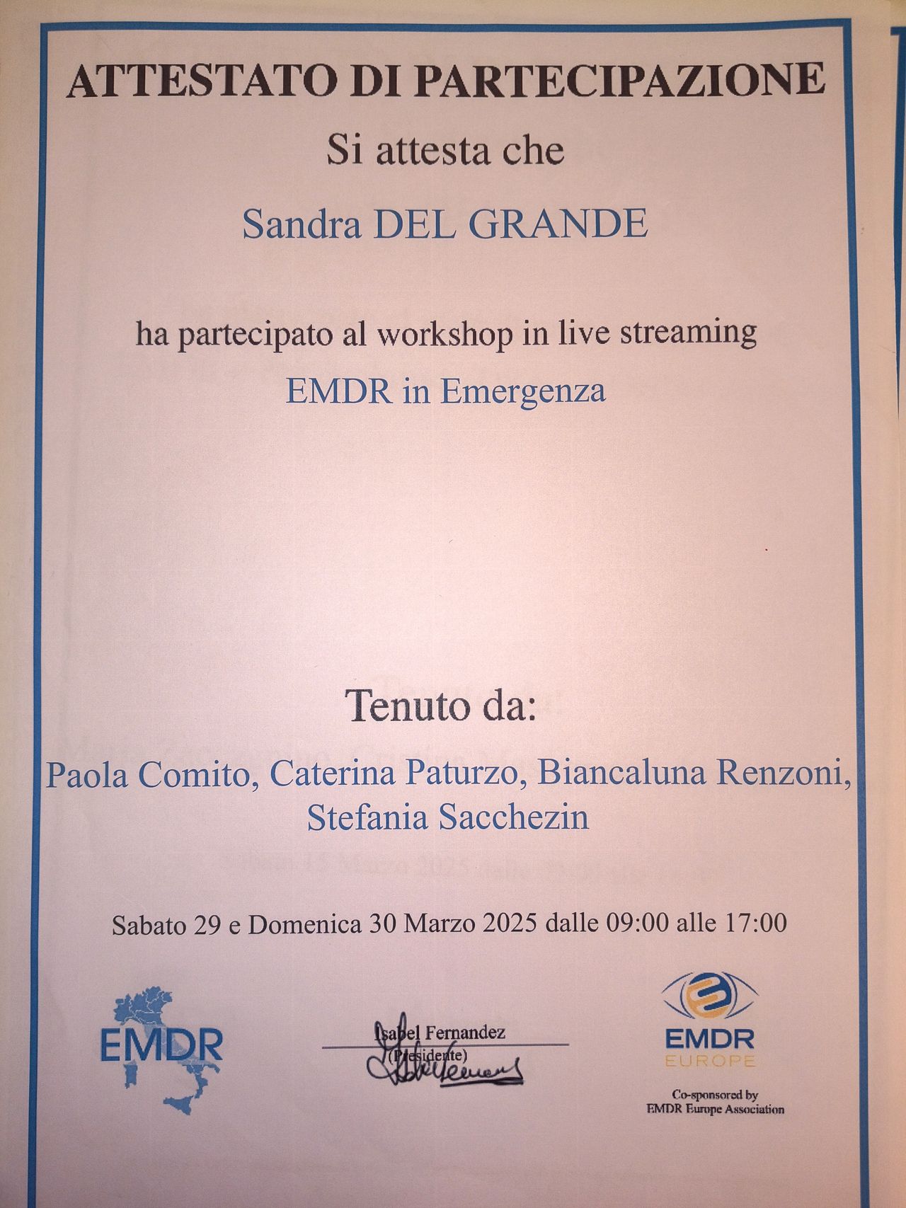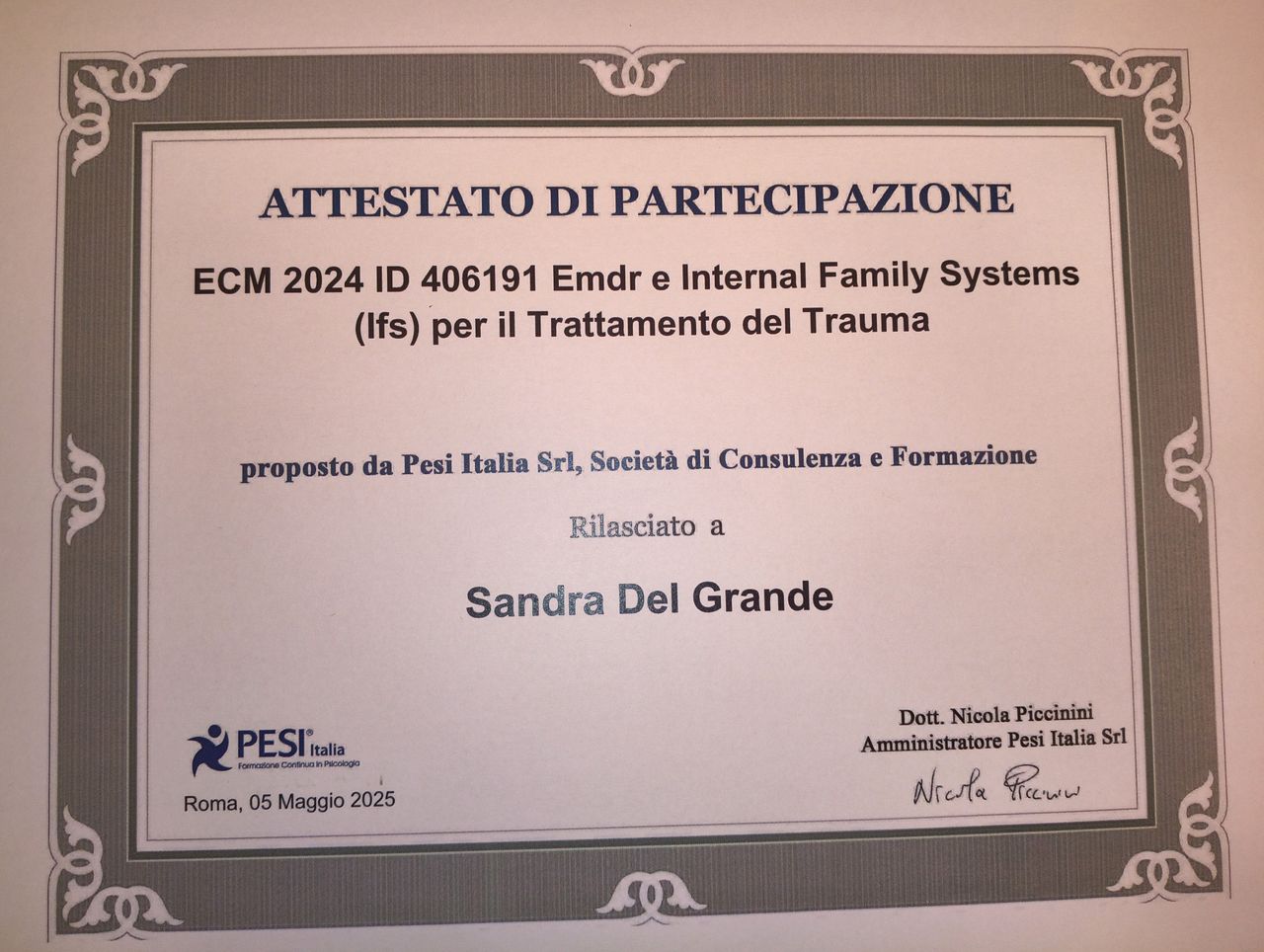 La dottoressa Del Grande è una professionista esperta, preparata ed empatica. Guida e adatta la terapia alla persona, riesce ad entrare in sintonia con chi si rivolge a lei. Personalmente ha aiutato me e la mia famiglia a superare dei momenti critici. Il suo approccio multiplo (emdr, terapia emozionale, ecc) mi è stato utile a focalizzarmi sulla mia crescita e sull'elaborazione dei traumi per affrontare la vita quotidiana con più serenità e lucidità. Un ulteriore suo merito è di essere una professionista umana, ti fa sentire accolta, ascoltata e accompagnata nel percorso di terapia.