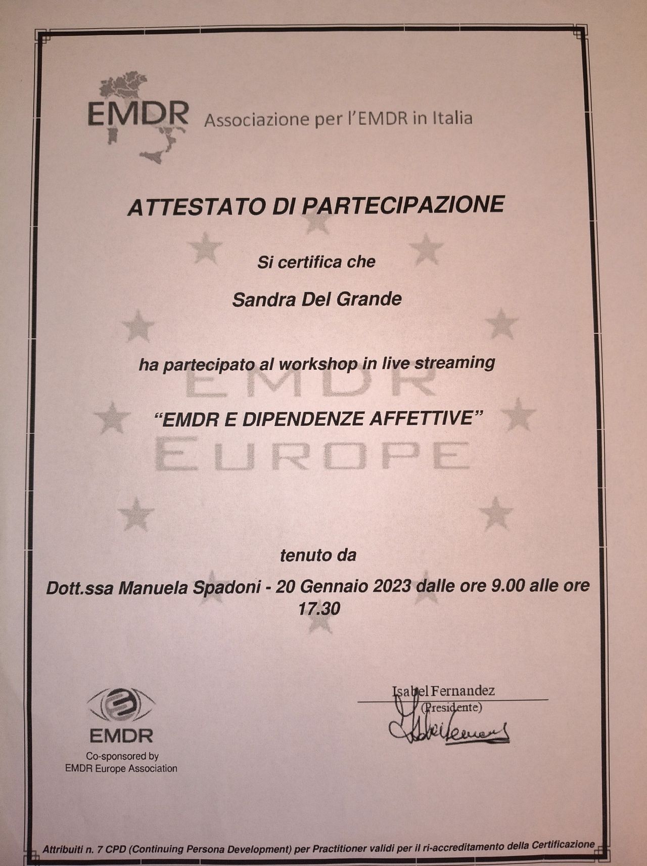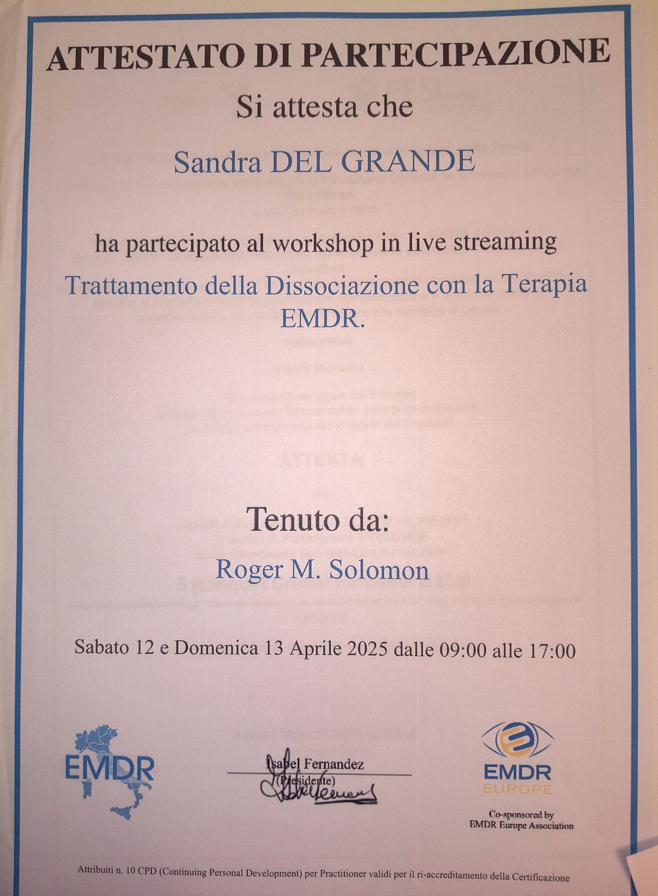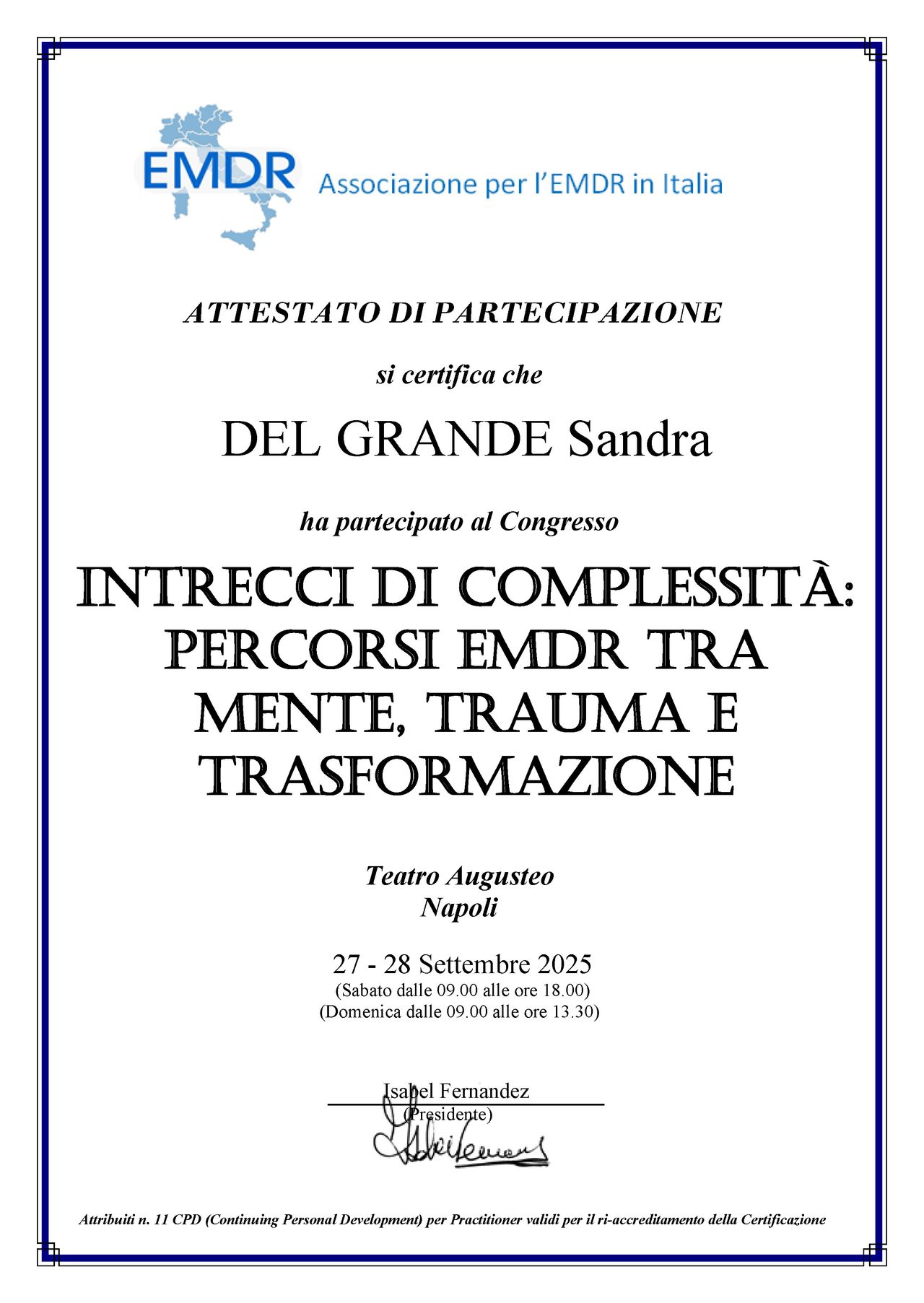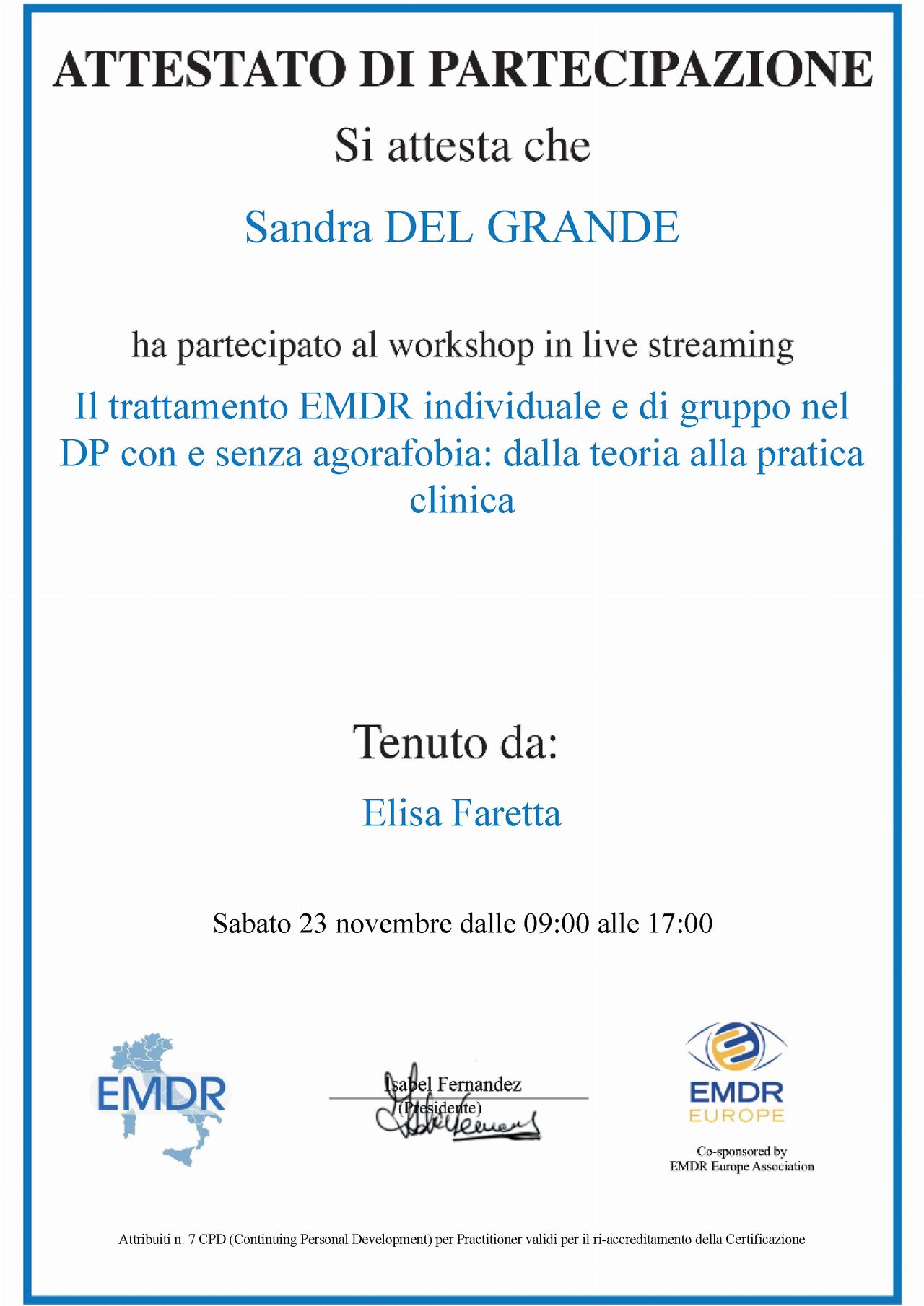 La dottoressa Del Grande è una professionista esperta, preparata ed empatica. Guida e adatta la terapia alla persona, riesce ad entrare in sintonia con chi si rivolge a lei. Personalmente ha aiutato me e la mia famiglia a superare dei momenti critici. Il suo approccio multiplo (emdr, terapia emozionale, ecc) mi è stato utile a focalizzarmi sulla mia crescita e sull'elaborazione dei traumi per affrontare la vita quotidiana con più serenità e lucidità. Un ulteriore suo merito è di essere una professionista umana, ti fa sentire accolta, ascoltata e accompagnata nel percorso di terapia.