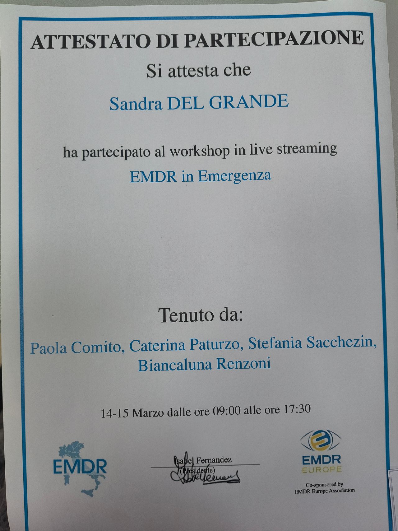 La dottoressa Del Grande è una professionista esperta, preparata ed empatica. Guida e adatta la terapia alla persona, riesce ad entrare in sintonia con chi si rivolge a lei. Personalmente ha aiutato me e la mia famiglia a superare dei momenti critici. Il suo approccio multiplo (emdr, terapia emozionale, ecc) mi è stato utile a focalizzarmi sulla mia crescita e sull'elaborazione dei traumi per affrontare la vita quotidiana con più serenità e lucidità. Un ulteriore suo merito è di essere una professionista umana, ti fa sentire accolta, ascoltata e accompagnata nel percorso di terapia.