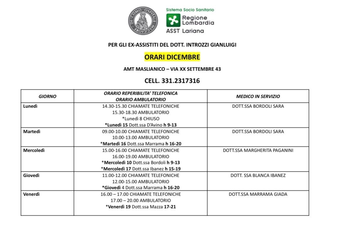 Buongiorno, si comunicano nell'immagine allegata gli orari e i turni dell'AMT Maslianico del mese di DICEMBRE. Le chiamate sono sempre nella prima ora dell'ambualtorio.