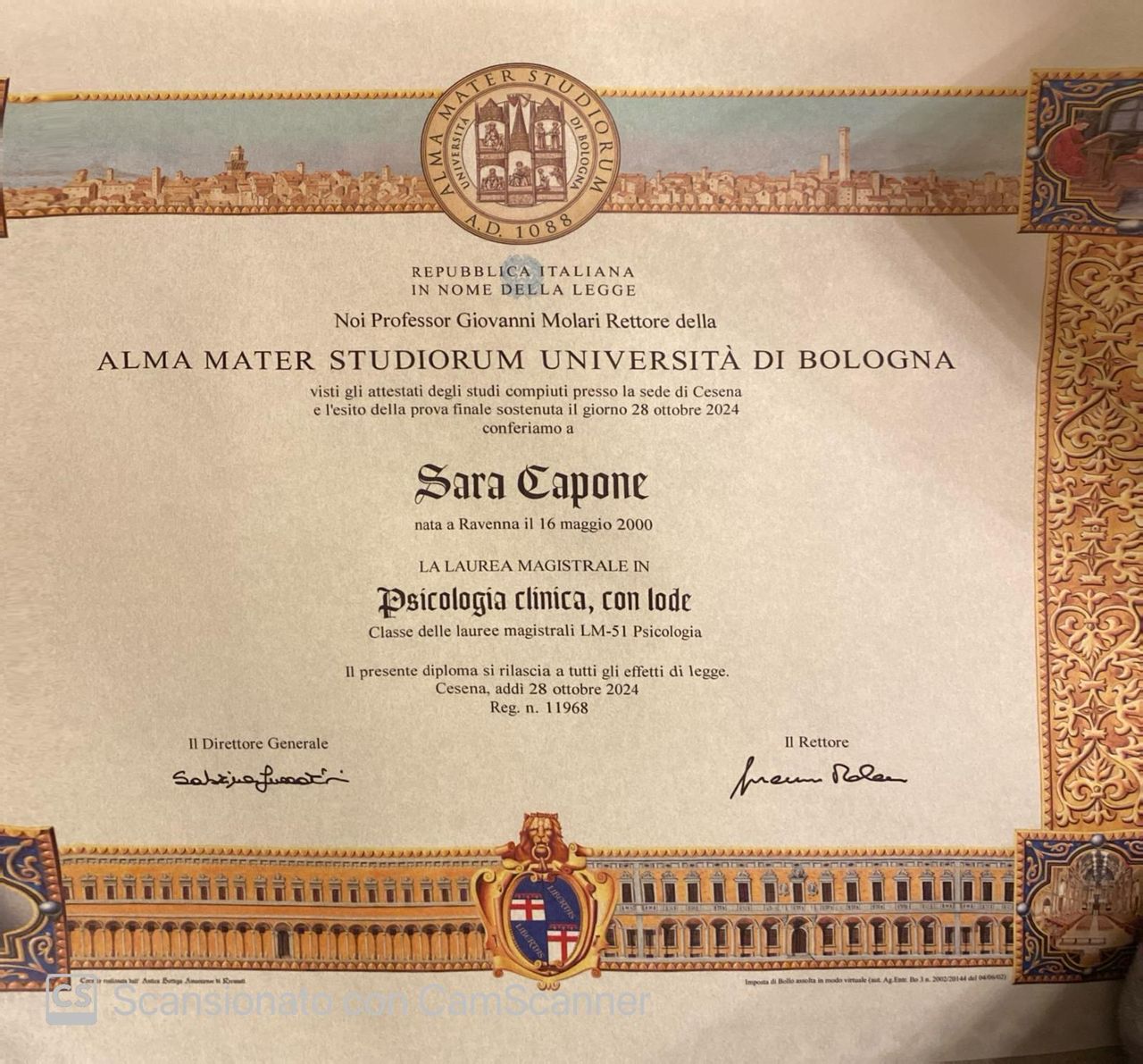 La Dott.ssa Sara Capone é una professionista nonché psicologa seria, preparata ed attenta alle problematiche del paziente. Con i suoi preziosi consigli mi ha aiutato ad affrontare le situazioni che mi creavano angoscia - grazie a lei ho trovato la luce in fondo al tunnel.