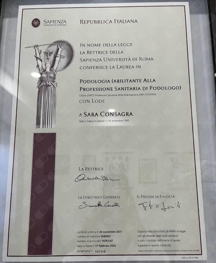 Lavoro presso lo studio "M&M Studio di Podologia" a Capua. Effettuo visite a domicilio nella provincia di Caserta. Sono la dott.ssa Sara Consagra, una podologa che si occupa di adulti e bambini. Tratto patologie del piede come l'unghia incarnita, le verruche, l'ipercheratosi, le ulcere diabetiche. Inoltre mi occupo anche di rieducazione ungueale (ortonixia). Sono laureata presso l'Università La Sapienza (Roma) e sono specializzata nel master "Podopatia Diabetica" presso l'Università degli studi di Roma Tor Vergata (Roma) Sono una professionista seria, preparata e disponibile.