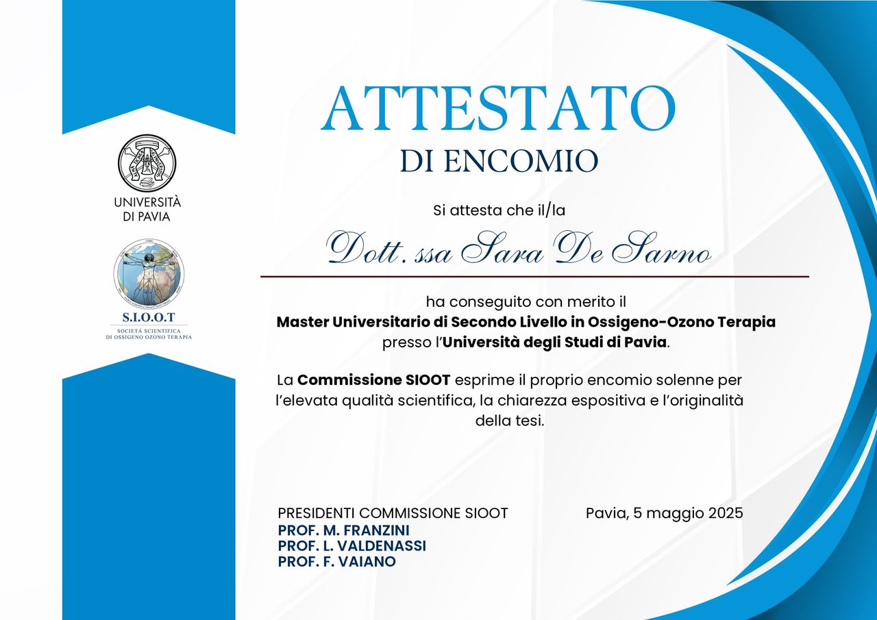 Ho conseguito con encomio il Master Universitario di secondo livello in ossigeno-ozono terapia presso l’Università degli studi di Pavia.