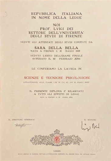 Sono la Dott.ssa Sara Della Bella, Psicologa con Specializzazione in Neuropsicologia e Psicoterapia, iscritta all'Albo dell'Ordine della Toscana con il n. 9062. Lavoro ogni giorno accanto a bambini, adolescenti e adulti che attraversano momenti di fatica, cambiamento o confusione, aiutandoli a riscoprire risorse, strategie e direzioni.