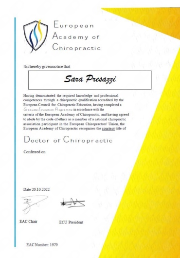 MI sono laureata in Spagna al "Madrid College of Chiropractic" con Lode e da studente sono stata responsabile Europea per il Congresso Mondiale di Studenti di Chiropratica (WCCS), ruolo che mi ha permesso di partecipare nel 2019 al Festival delle Nazioni Unite e alla 72° Assemblea Mondiale della Sanità.