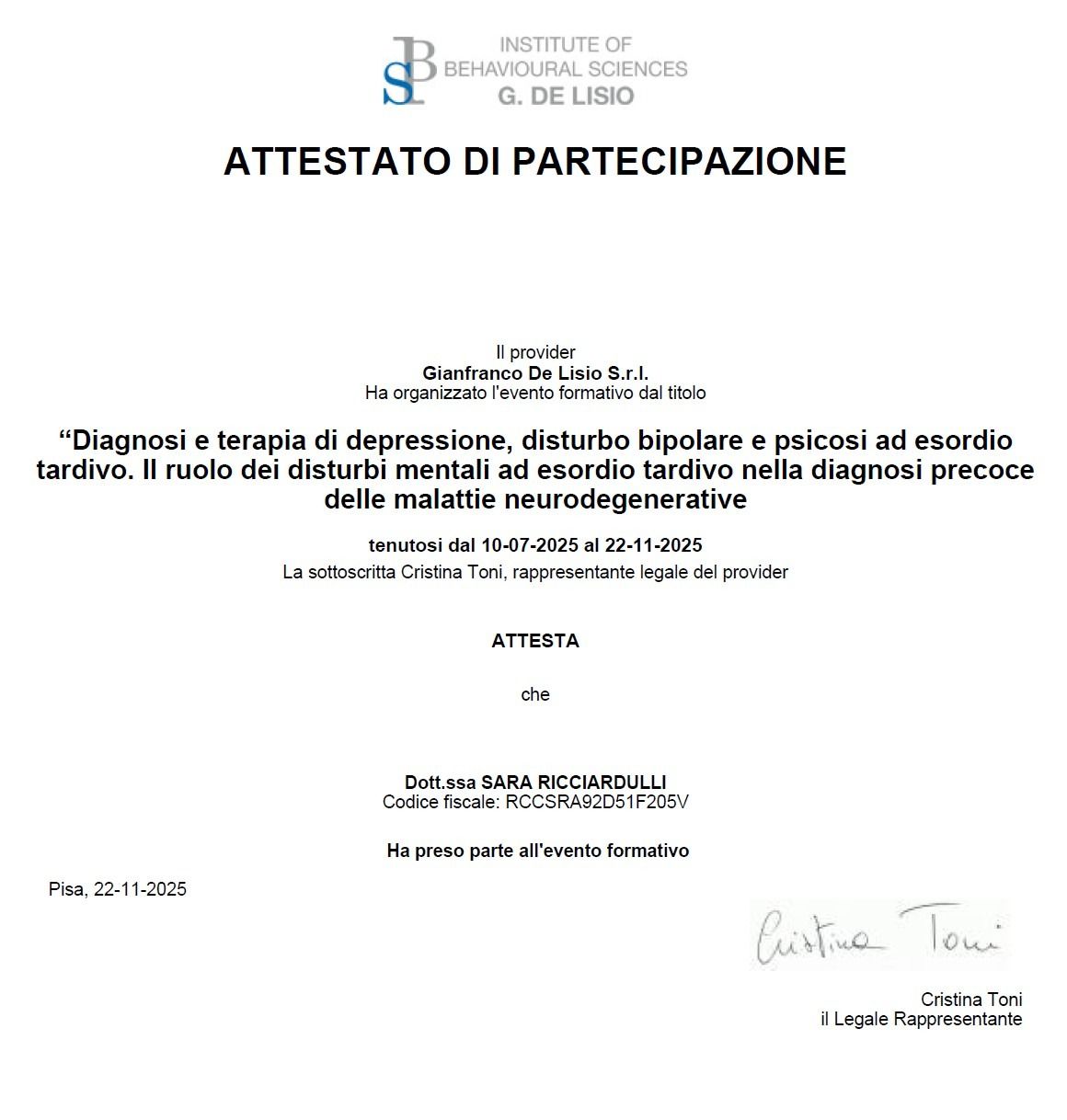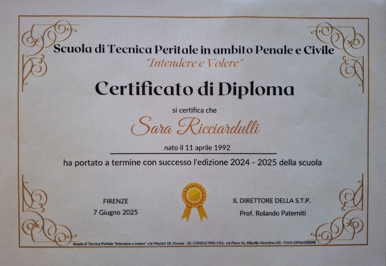 Ho completato la Scuola di Alta formazione in Tecnica Peritale a Firenze, occupandomi dei risvolti medico-legali della patologia psichiatrica in ambito penale e civile.