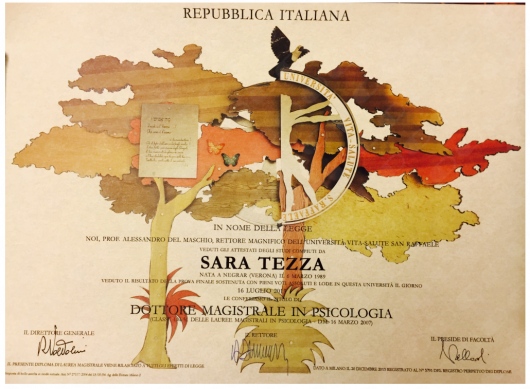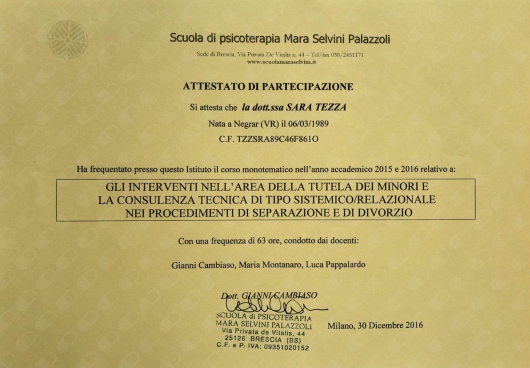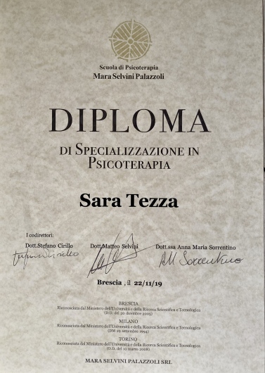Nel 2013 mi sono laureata in Psicologia Clinica presso l’Università “Vita-Salute S. Raffaele” di Milano e nel 2019 mi sono specializzata in Psicoterapia sistemico-relazione presso la Scuola “Mara Selvini Palazzoli” nella sede di Brescia.