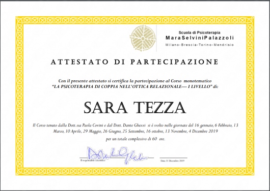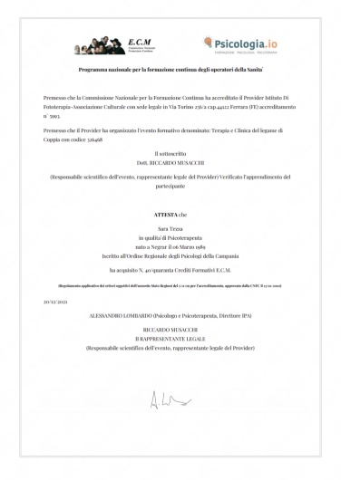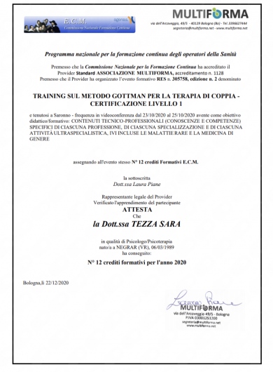 In seguito mi sono formata sulla psicoterapia di coppia attraverso un corso biennale specifico tenuto dal Dott. Ghezzi presso la mia scuola di specializzazione e frequentando il Training nel “Metodo Gottman”. Di seguito il link ad un'intervista sulla terapia di coppia per Radio Canale Italia: https://drive.google.com/file/d/1SoRXi2HH6DExnYt20jgXBqRD7hPdVuuP/view