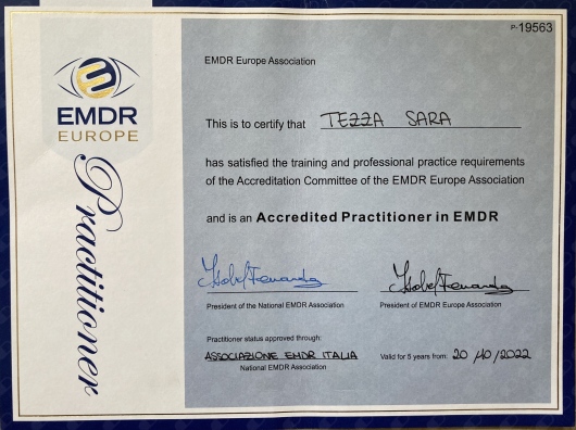 Sono una terapeuta EMDR (certificazione di Practitioner dell’EMDR Europe Association) un metodo psicoterapeutico strutturato, che facilita il trattamento di diverse psicopatologie e problemi legati sia ad eventi traumatici (es. lutti, abusi, incidenti, diagnosi infauste), che ad esperienze più comuni, ma emotivamente stressanti (es. abbandoni, trascuratezza, umiliazioni).