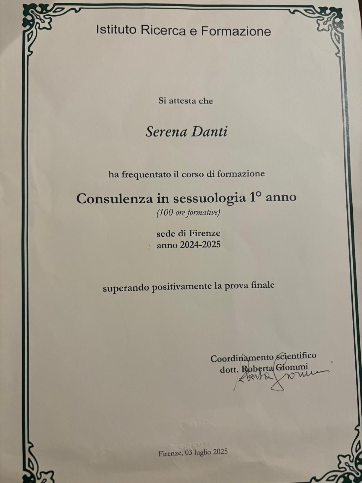 Ho contattato la Dott.ssa Danti in un momento in cui stavo vivendo un periodo di forte calo del desiderio e difficoltà nel rapporto con il mio corpo e la sfera intima. Fin dai primi incontri mi sono sentita accolta, ascoltata e mai giudicata. La dottoressa ha saputo creare uno spazio sicuro e sereno, dove poter riflettere sulle mie emozioni e comprendere le cause più profonde del mio disagio.