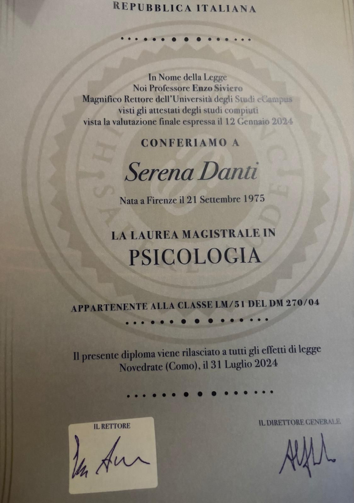 La dottoressa Serena Danti è una professionista straordinaria. Mi ha aiutato ad affrontare alcune difficoltà fornendomi gli strumenti giusti, con grande competenza, sensibilità e umanità. Grazie al suo supporto posso dire di aver ritrovato energie sopite.