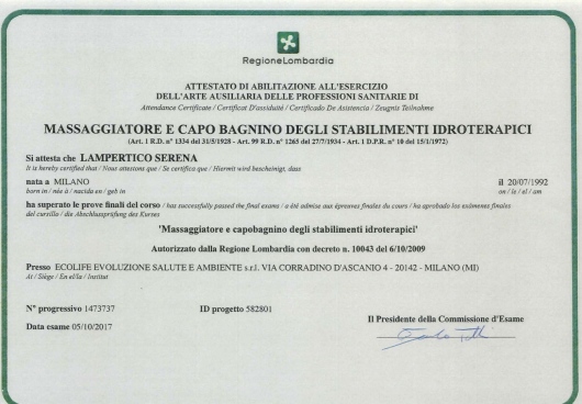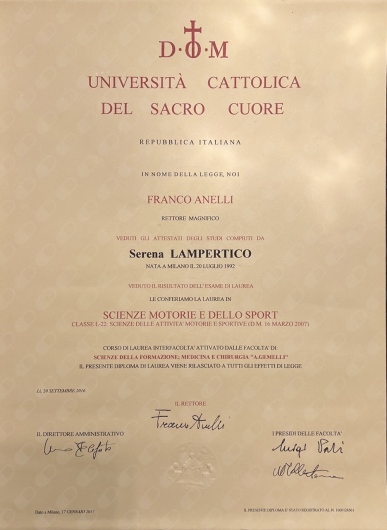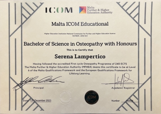Ho conseguito la Laurea Triennale in Scienze delle Attività Motorie e Sportive (L-22) presso l’Università Cattolica del Sacro Cuore di Milano, diventando Chinesiologa. Proseguo poi gli studi presso Ecolife Milano e prendo l’abilitazione alla professione di Massoterapista (MCB). Al termine di questi anni di studio decido di proseguire la mia formazione iscrivendomi per altri 5 anni al corso di Laurea in Osteopatia presso l’ICOM (International College of Osteopathic Medicine) frequentando le lezioni tra l’Italia e Malta e svolgendo più di 1000 ore di tirocinio clinico pratico, ottenendo il titolo Bachelor in Osteopathy with Honours (BSc.Hons.Ost).
