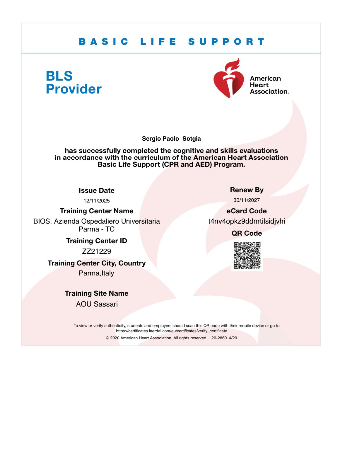 Iscritto all'Ordine dei Medici Chirurghi e Odontoiatri (FNOMCeO) della Provincia di Sassari con numero iscrizione : 5050