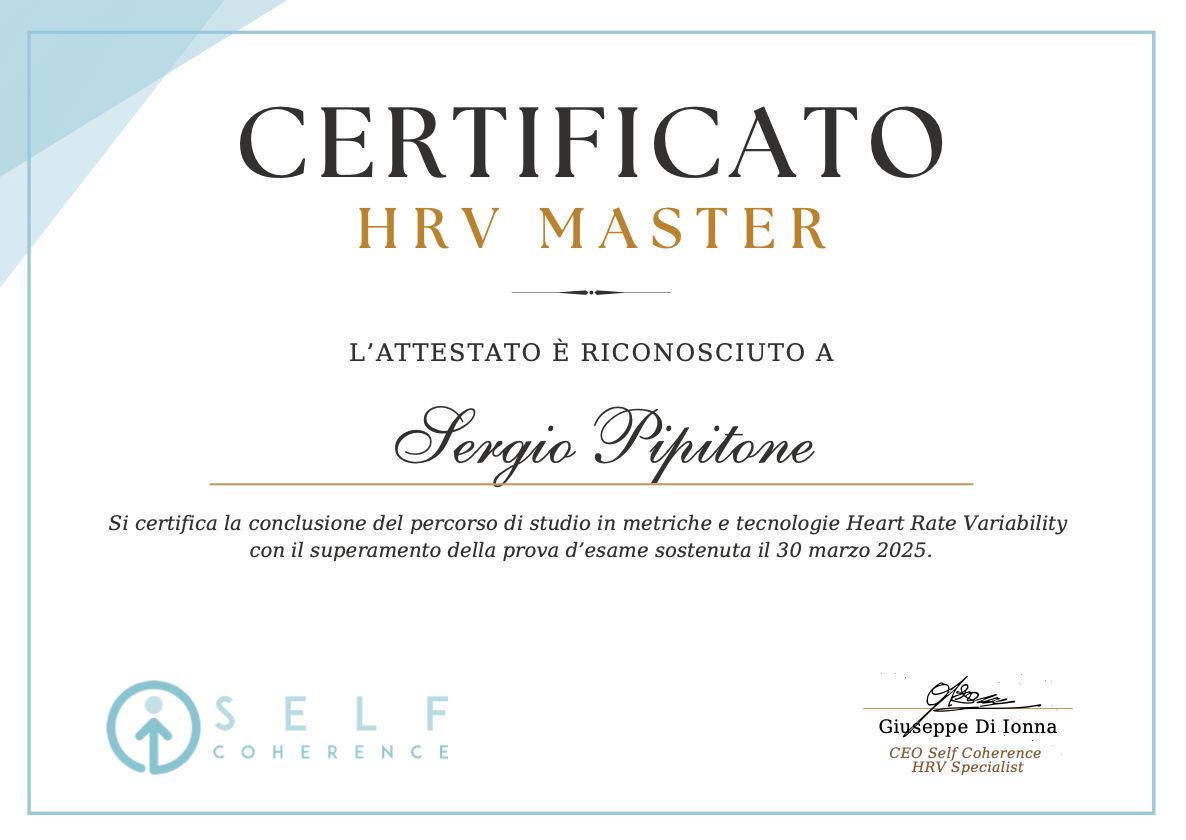 - Valutazione della HRV (Heart Rate Variability) e training di coerenza cardiaca tramite biofeedback con dispositivo EmWave Pro – HeartMath, per regolare il sistema nervoso autonomico, ridurre lo stress e migliorare il recupero psicofisico. Certificazione rilasciata da Self Coherence, scuola di formazione riconosciuta in ambito di biofeedback.