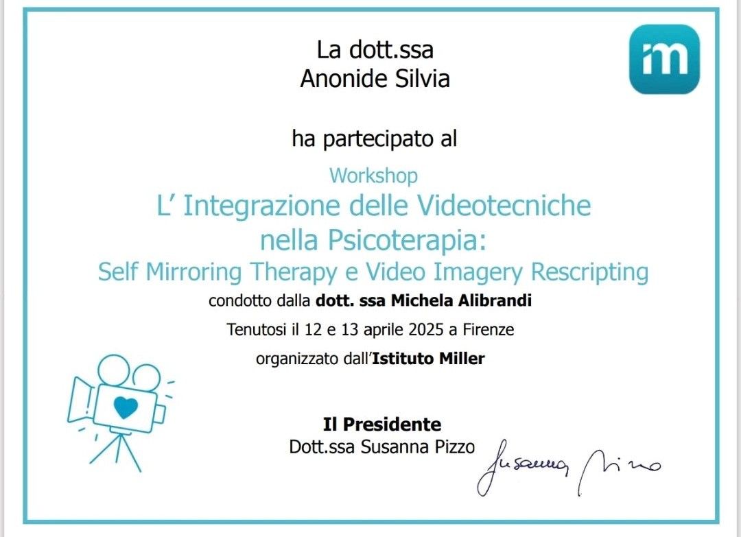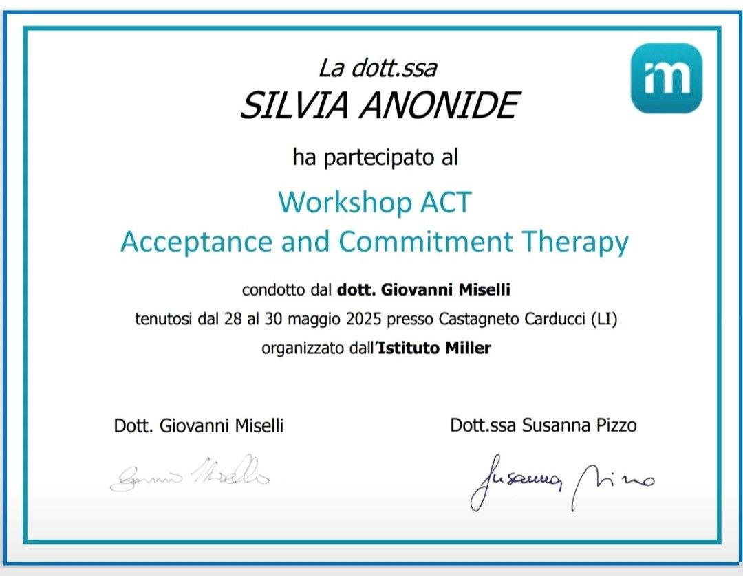 Ho intrapreso questo percorso psicologico per affrontare i miei problemi di ansia. Grazie a questo percorso sono riuscita a superare l'ansia che mi impediva di fare tante cose nella mia vita. E' un percorso che intraprenderei di nuovo per prendermi cura di me stessa e lo consiglio a chiunque voglia sconfiggere l'ansia.
