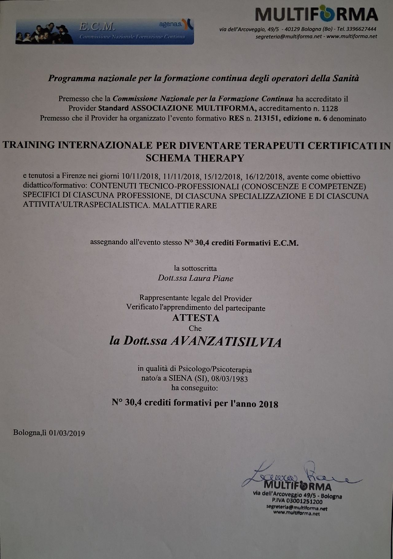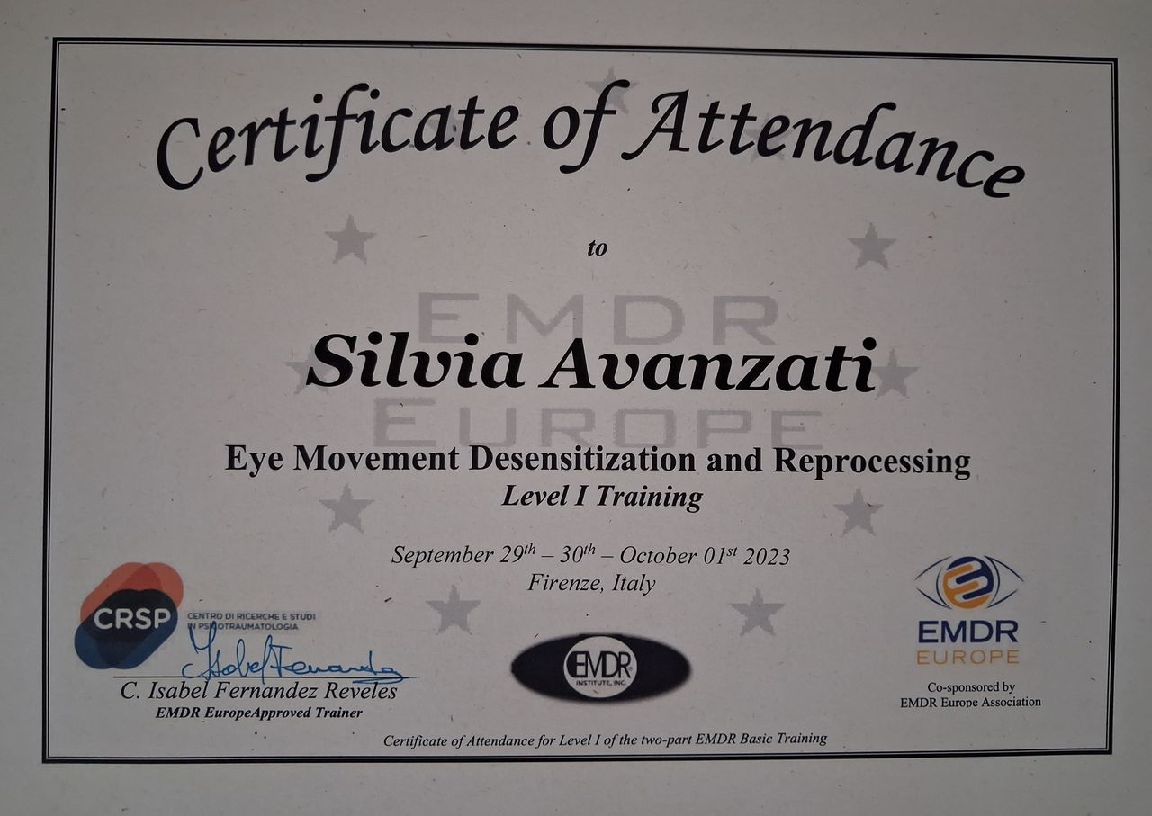 Dopo la specializzazione, ho continuato la mia formazione conseguendo l'attestato in Schema Therapy, che coniuga tecniche della terapia cognitivo comportamentale, interpersonale e psicodinamica, con l'obiettivo di aiutare persone che hanno problemi psicologici di lunga durata. In seguito ho conseguito la formazione in EMDR (Eye Movement Desensitization and Reprocessing) trattamento volto alla cura dei disturbi post traumatici da stress (PTSD) e di qualunque disfunzione legata ad esperienze stressanti e/o traumatiche.