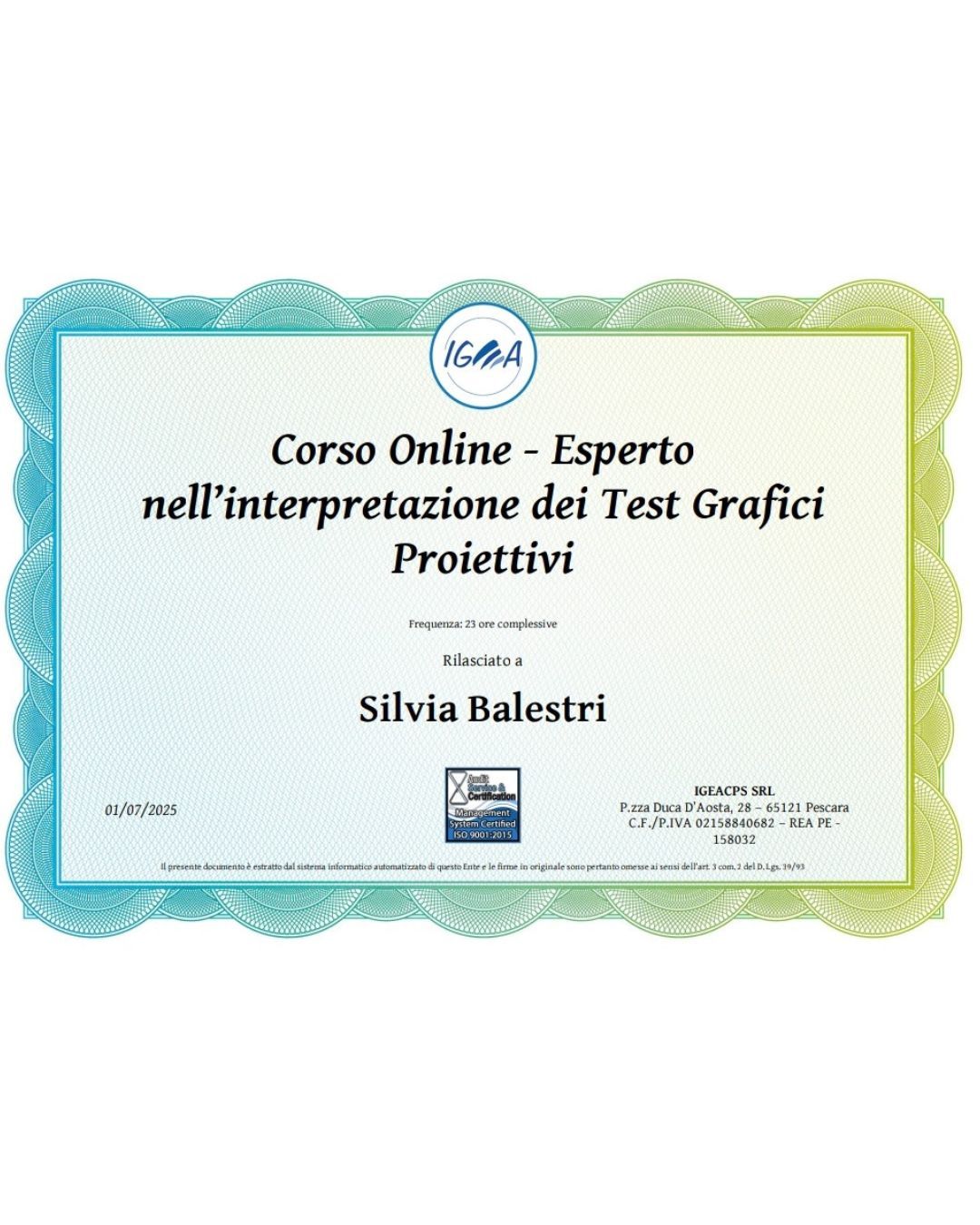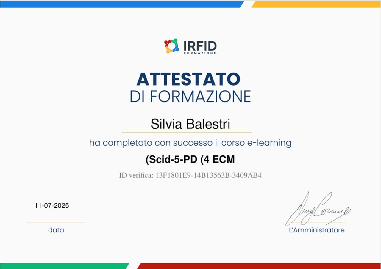 Sono una psicologa clinica iscritta alla Sezione A dell'albo degli psicologi della Regione Emilia-Romagna (n. iscrizione 11800). Sono formata come esperto Mindfulness presso IEPP- Istituto Europeo di Psicologia Positiva per quanto riguarda la gestione emotiva.