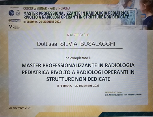 Ho deciso inoltre di dedicarmi ai "più piccoli" ampliando le mie competenze in ambito pediatrico; ho lavorato come Dirigente Medico di I livello presso il reparto di Radiologia Pediatrica dell'Ospedale Civico di Cristina di Palermo e conseguito un Master in Radiologia Pediatrica.