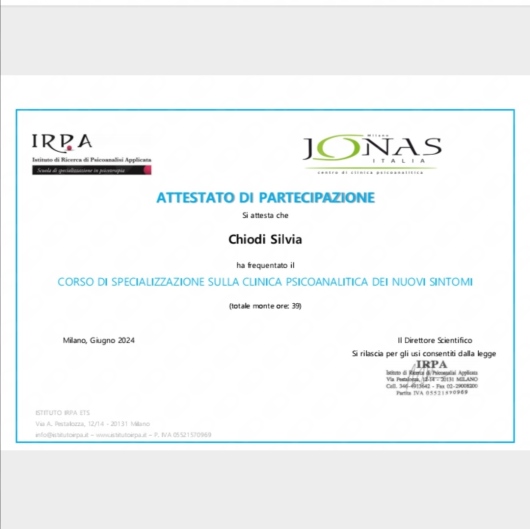 2015 Specializzazione in PSICOTERAPIA AD INDIRIZZO PSICOANALITICO presso Istituto Freudiano per la clinica, la terapia e la scienza. Scuola Lacaniana di Psicoanalisi.