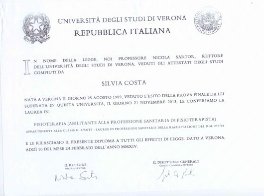 Iscrizione all'Ordine delle professioni sanitarie tecniche, della riabilitazione e della prevenzione nell'Albo dei Fisioterapisti al NR. 726