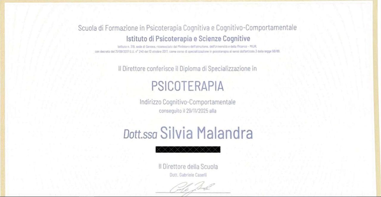 Sono la Dott.ssa Silvia Malandra, Psicologa e Psicoterapeuta a orientamento Cognitivo-Comportamentale iscritta all'Ordine degli Psicologi della Lombardia. Ho scelto questo lavoro perché ho sempre avvertito il desiderio di comprendere le emozioni e le esperienze delle persone. Con il tempo, questo interesse si è trasformato in una forte passione nell' affiancare chi cerca un ascolto empatico e senza giudizio. Credo che, anche nei momenti difficili, ognuno di noi possieda risorse interiori che possono essere riscoperta, ed è un piacere poter accompagnare le persone in questo viaggio di crescita e consapevolezza. Lavoro con bambini, adolescenti, adulti e anziani, utilizzando un approccio pratico e collaborativo basato sulla terapia cognitivo-comportamentale, essendo sempre stata affascinata dal modo in cui pensieri, emozioni e comportamenti si influenzano a vicenda. Insieme è possibile esplorare le difficoltà che si stanno affrontando, comprendendo i pensieri e i comportamenti che le alimentano, e sviluppando strategie concrete per affrontare le sfide quotidiane con maggiore serenità e consapevolezza. Credo nel cambiamento e nel fatto che ogni persona abbia le sue risorse per riscoprire il proprio benessere, a proprio ritmo e con il giusto supporto. Il mio obiettivo è offrire uno spazio sicuro e senza giudizio, dove potersi sentire ascoltato e supportato e dove poter ritrovare consapevolezza e equilibrio.