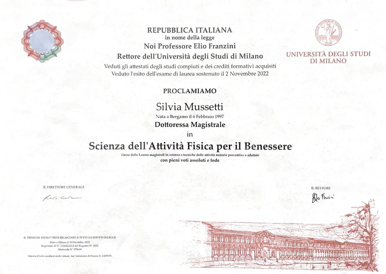 Sono Silvia Mussetti, Massoterapista e Chinesiologa, laureata con lode in Scienze Motorie, Sport e Salute e in Scienze dell’Attività Fisica per il Benessere presso l’Università degli Studi di Milano.