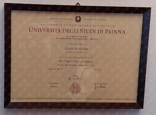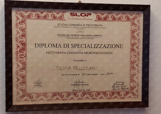 Sono iscritta all’albo dell’Ordine degli Psicologi della Lombardia (OPL) nr. 03/15026, dopo essermi Laureata presso la Facoltà di Psicologia di Padova; ho poi continuato la mia formazione, specializzandomi in Psicoterapia presso la SLOP (Scuola di Specializzazione in Psicoterapia Cognitivo-Neuropsicologica) dove ho completato il ciclo diventando Tutor didattica e Docente. In seguito ho conseguito il Master in Neuroscienze Cliniche presso l'Università Cattolica.