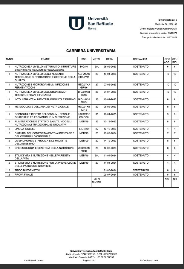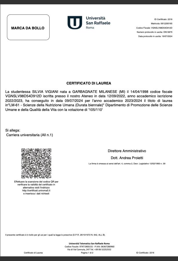 Biologa nutrizionista con laurea magistrale in Scienze della Nutrizione Umana. Attualmente studentessa della scuola di specializzazione SANIS Nutrizione Sportiva, collaboro con il centro medico Figurella di Bresso (MI) e di Milano De Angeli e la palestra Actionfit di Gallarate (VA), dove ricevo nel il mio studio privato, oltre alle visite online e a domicilio nella zona di Limbiate (MB) e paesi limitrofi. Specializzata nella ricomposizione corporea (perdita di massa grassa, aumento massa muscolare), gestione della pre-menopausa e menopausa, pazienti geriatrici, adolescenti, diabete, obesità, DCA.